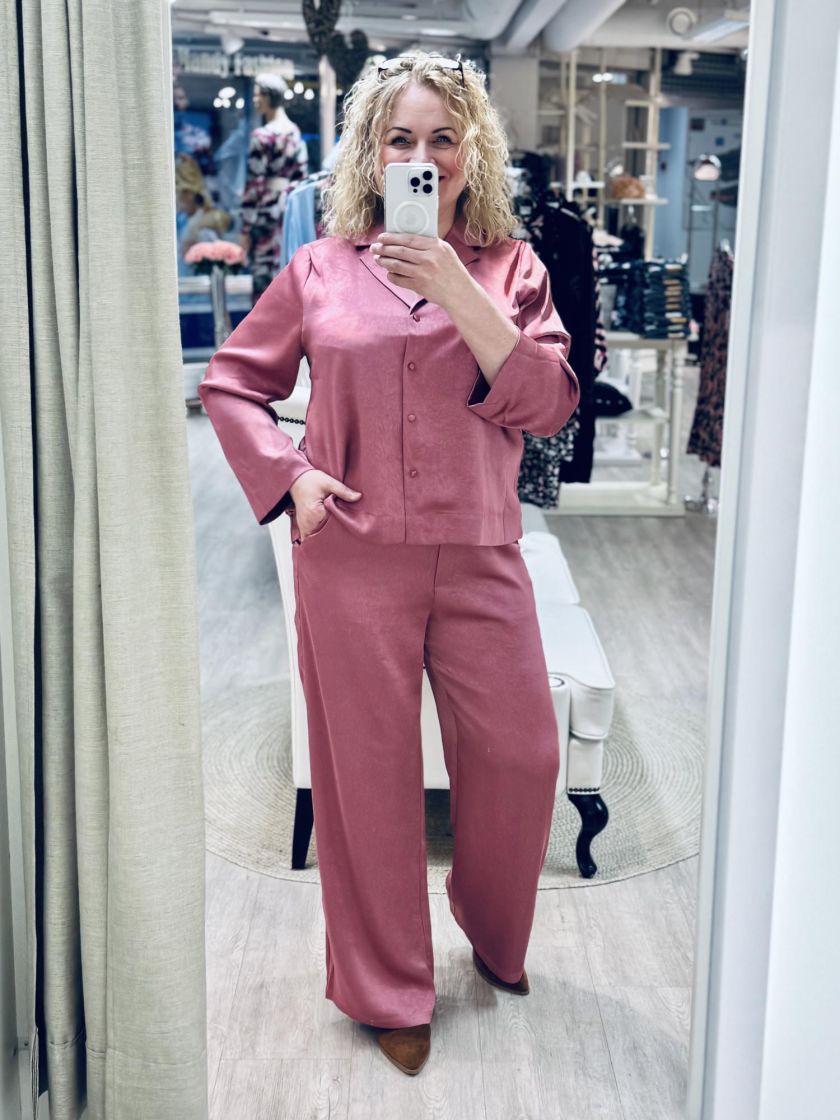 Samaa sarjaa löytyy housut, mutta toimii mainiosti myös esimerkiksi farkkujen tai suorien housujen kanssa. A-VIEW pusero kaunista, tukevaa ja hieman ryppypintaista satiinia. Puserossa on reilut kaulukset ja edessä napitus. Malli on suora.