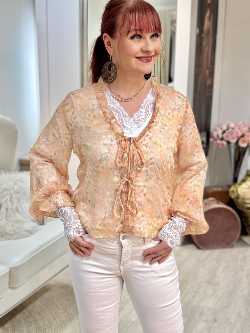 Kiva malli myös mekkojen kanssa! A-VIEW unelman kevyt frillajakku/pusero läpikuultavaa sifonkia. Pääntiellä ja edessä kiertää kapea frilla ja edessä on kahdet solmittavat nauhat. Myös hihansuussa hulmuaa frillat ja ryhtiä antaa kuminauha. Alle voi laittaa topin. Malli on siro.
