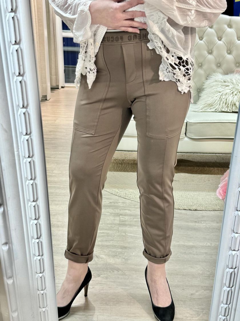 Cecil housut pehmeän taupen värissä. Housussa on joustovyötärö leveällä tekstijoustonauhalla, takana on valetaskut ja edessä viistotaskut. Ilmettä antaa myös kivat leikkaukset. Materiaali on hyvin joustavaa, ohutta, mukavan liukaspintaista ja hieman siftaavaa. Vyötärönkorkeus on normaali. Tarkistathan mitat.