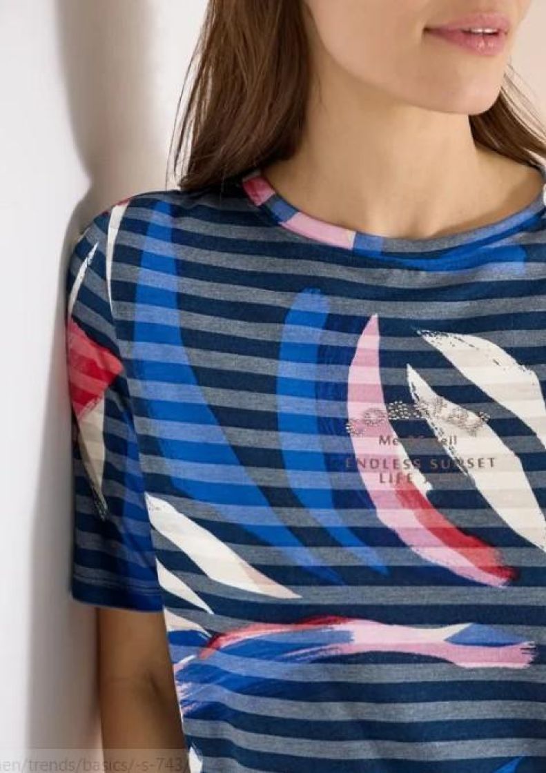 Väriä asuun pehmeällä t-paidalla! Cecil paita ohutta ja erittäin pehmeää viskoosisekoitetta. Paidassa kiva värikäs kuosi ja edessä teksti. Kivana jujuna on joustonauha helmassa, jolla voi säädellä paidan istuvuutta.