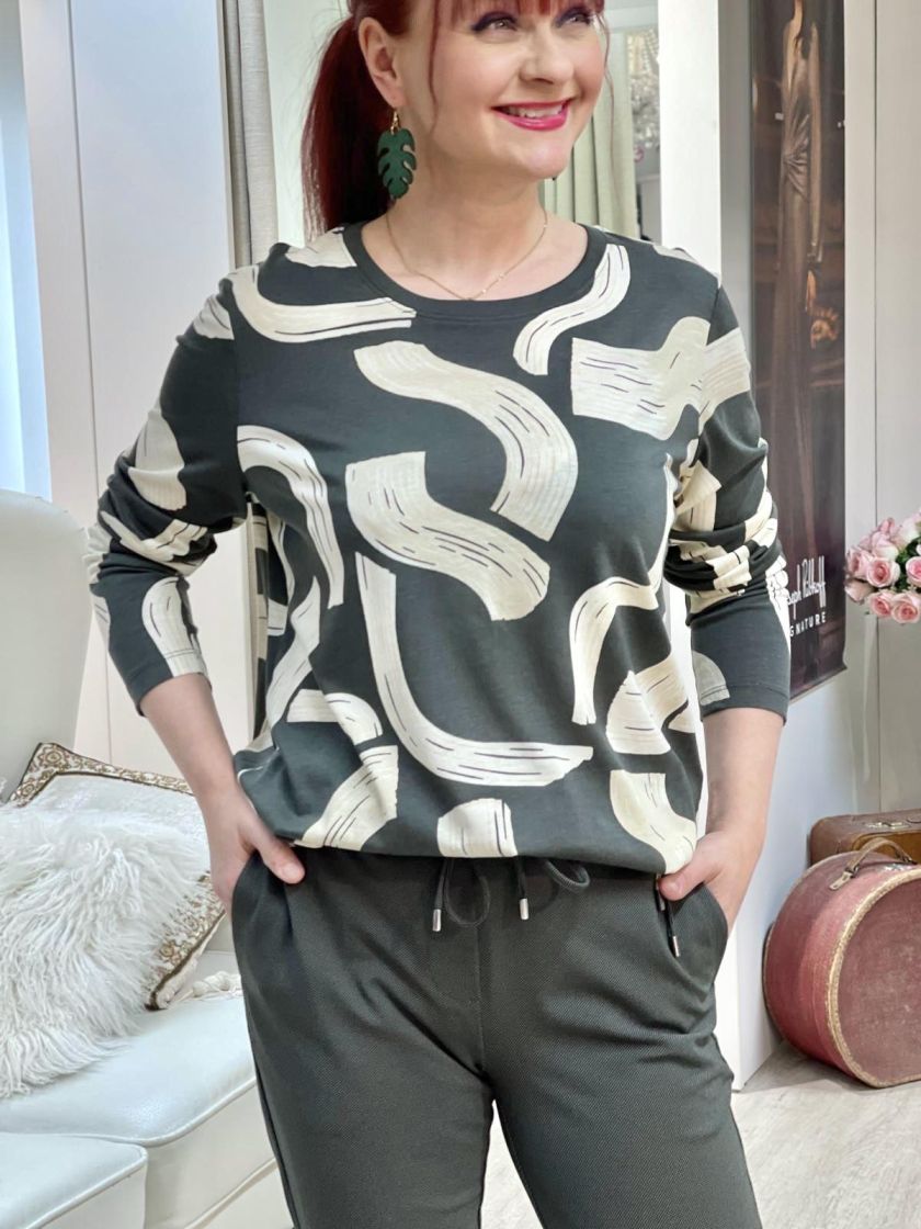 Cecil paita ohutta ja pehmeää trikoota. Jujuna on kiva kuosi ja helmassa kiristysnauhat. Materiaali on mukavaa puuvilla-modaalia.