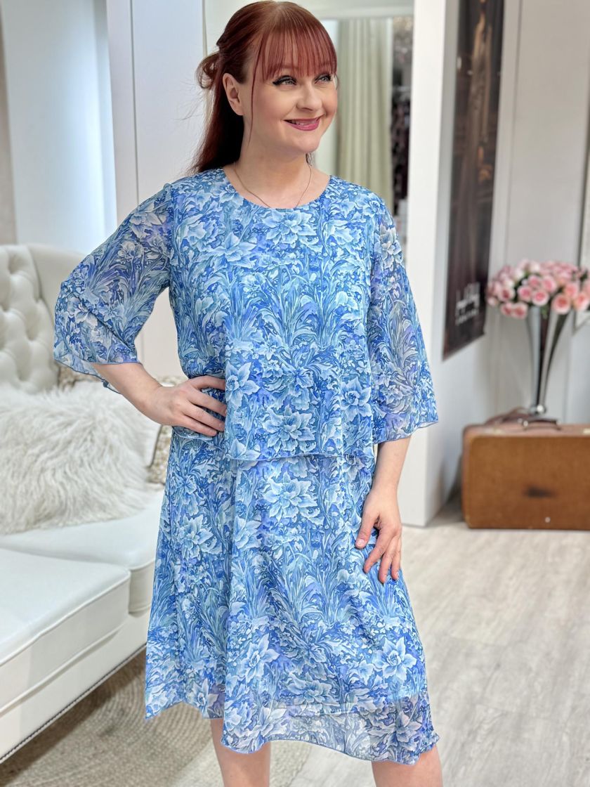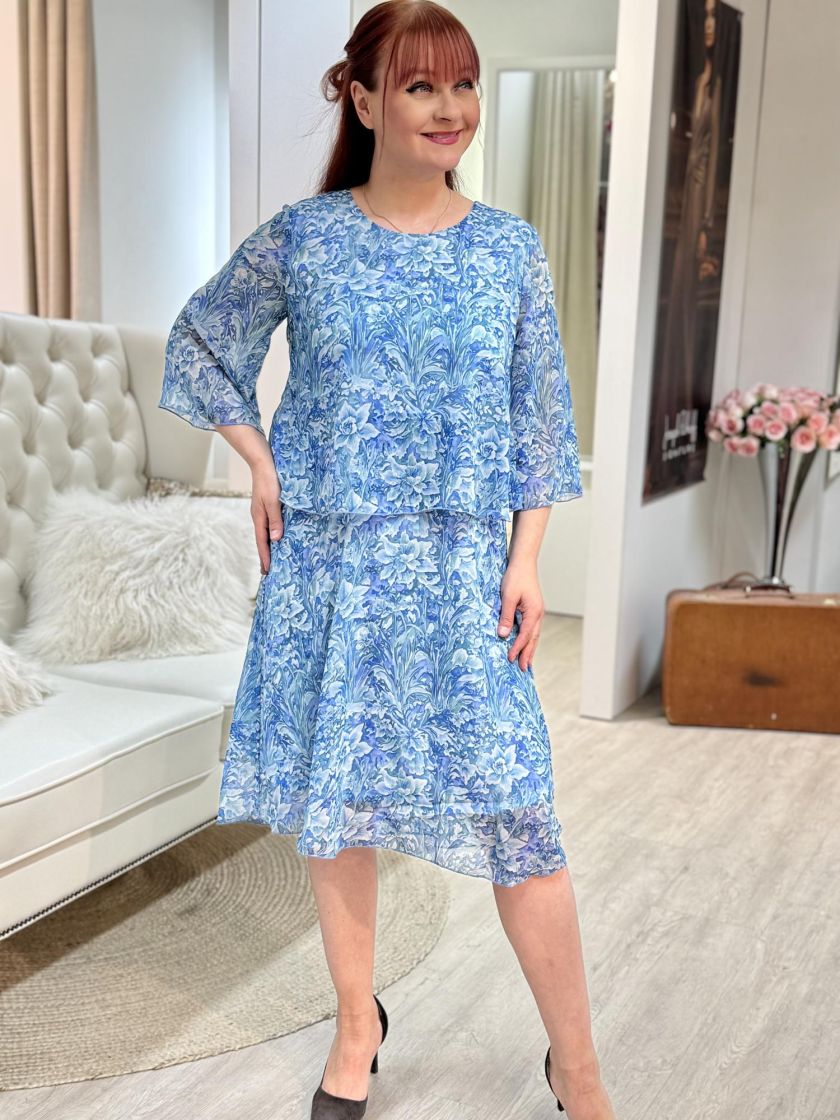 Godske upea kukallinen sifonkimekko. Alla on mukavan joustava vuori ja kauniisti kerrostettu helma. Hiha on läpikuultava ja vajaamittainen. Normaali mitoitus.