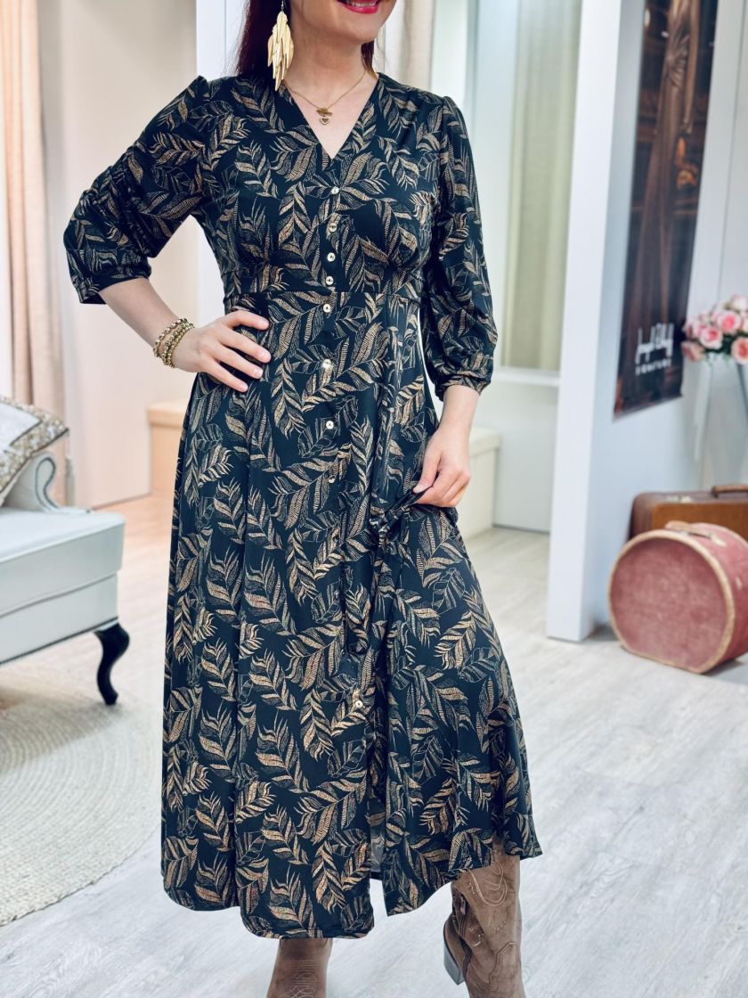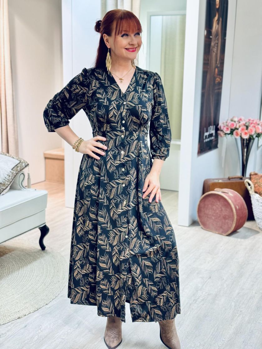 In Front mekko kauniilla sulkakuosilla. Malli on kauniisti ylhäältä istuva ja helma upeasti kellottuva. Pussihihaan ryhtiä tuo hihansuussa kaitale ja vyötäröllä taakse solmittavat kaitaleet. Nappilista edessä on kiinniommeltu. Materiaalina mukavan joustava, liukaspintainen ja ohut pese ja pidä trikoo, jossa kiva hieman kiiltävä pinta.