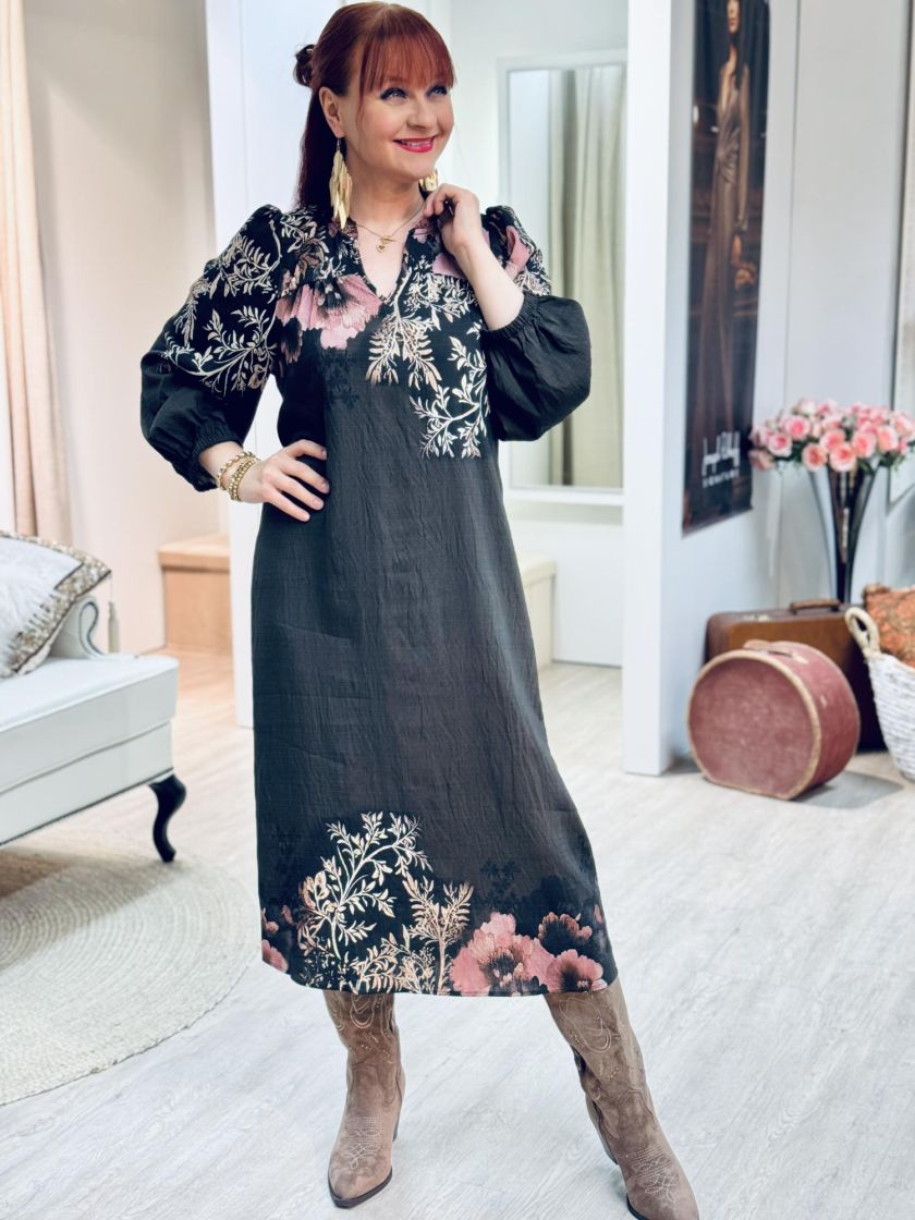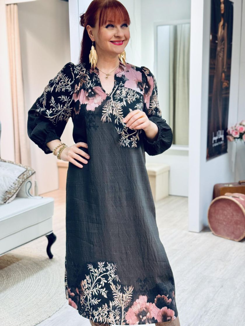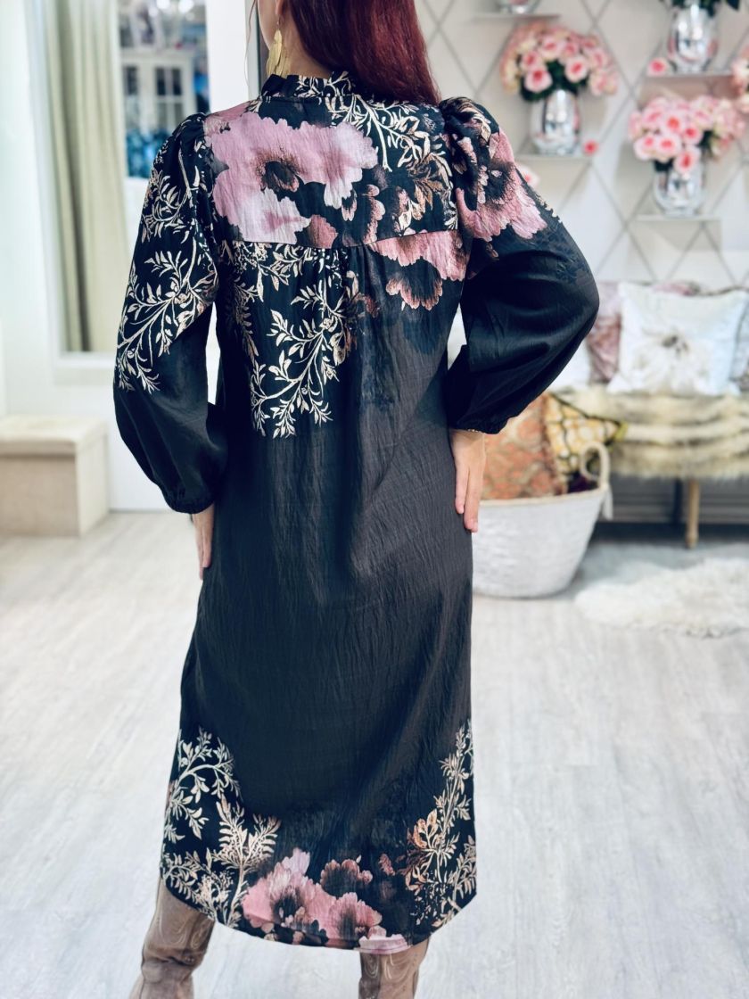 In Front syvän ruskea mekko upealla kuosilla helmassa ja ylhäällä. Kuosin lisäksi kankaassa on kevyt vaakaraita. Edessä ja takana on kaarrokkeet ja kaarrokkeen alla on rypytystä. Hihaan antaa ryhtiä kuminauha ja pääntiellä ilmettä frillakaulus. Materiaali on ohutta ja hieman siftaavaa viskoosisekoitetta. Malli on väljä ja mitoitus reilu. Tarkistathan mitat.
