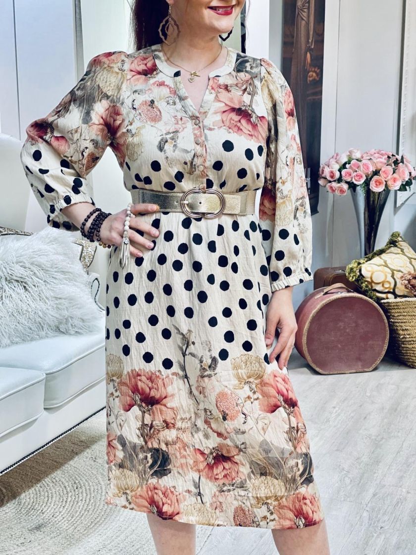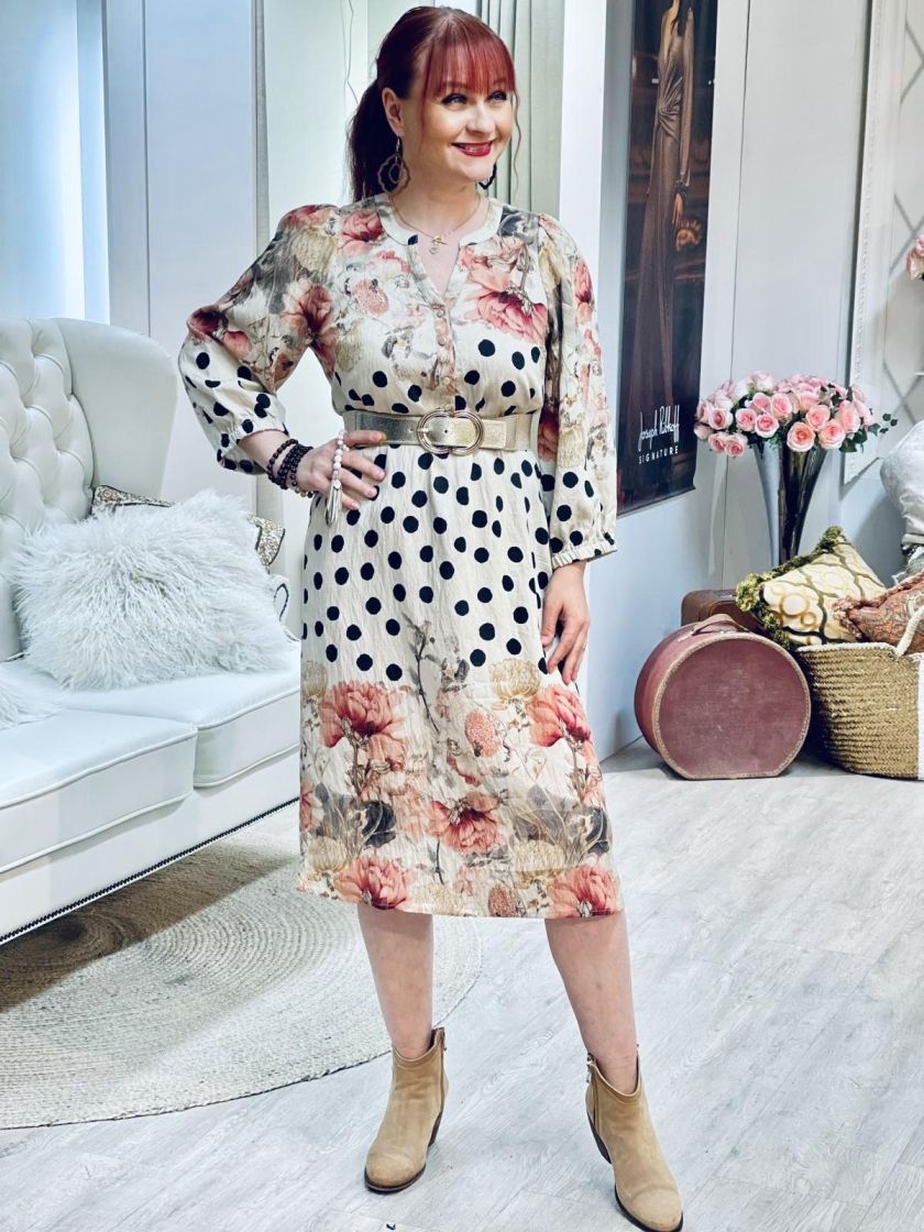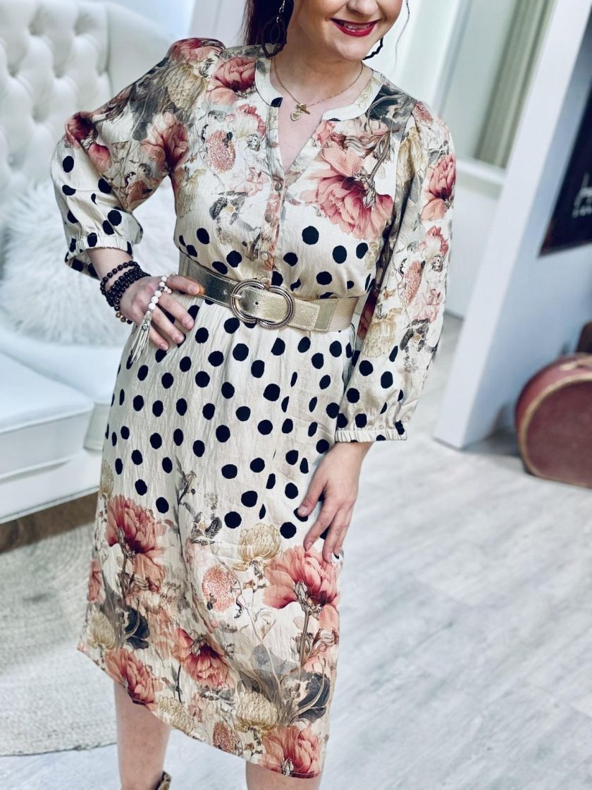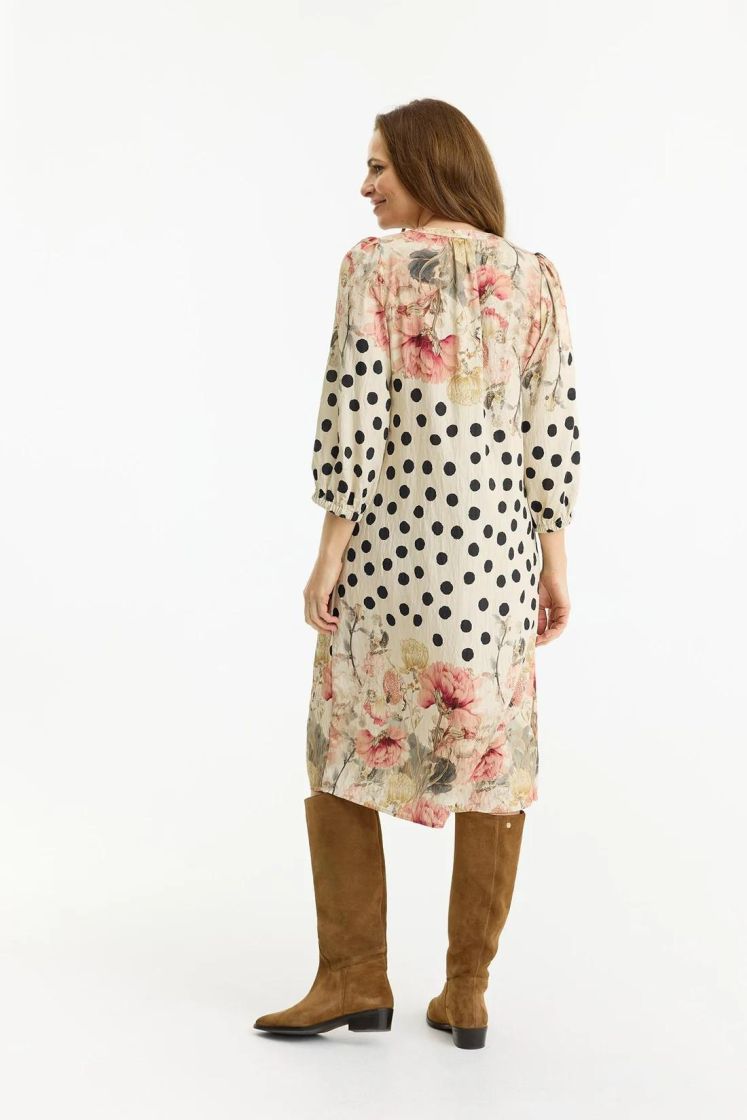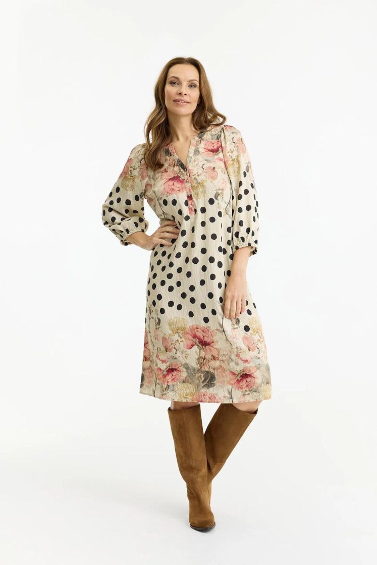 Upea arkeen ja juhlaan! In Front mekko upealla kuosilla, jossa yhdistyy pallot ja kukat. Edessä pääntien alla on nappeja ja hihaan antaa ryhtiä kuminauha. Malli on suora. Materiaali on ohutta ja hieman siftaavaa viskoosisekoitetta.