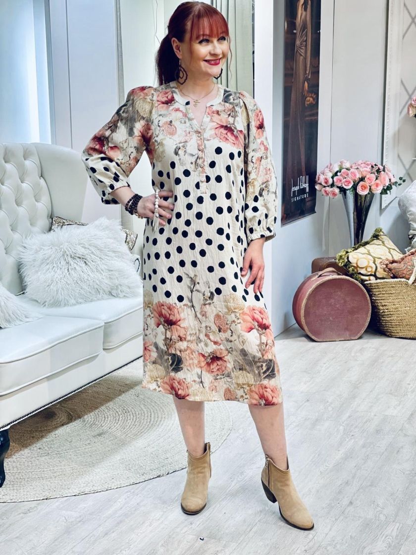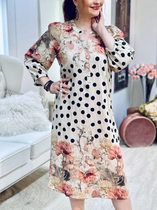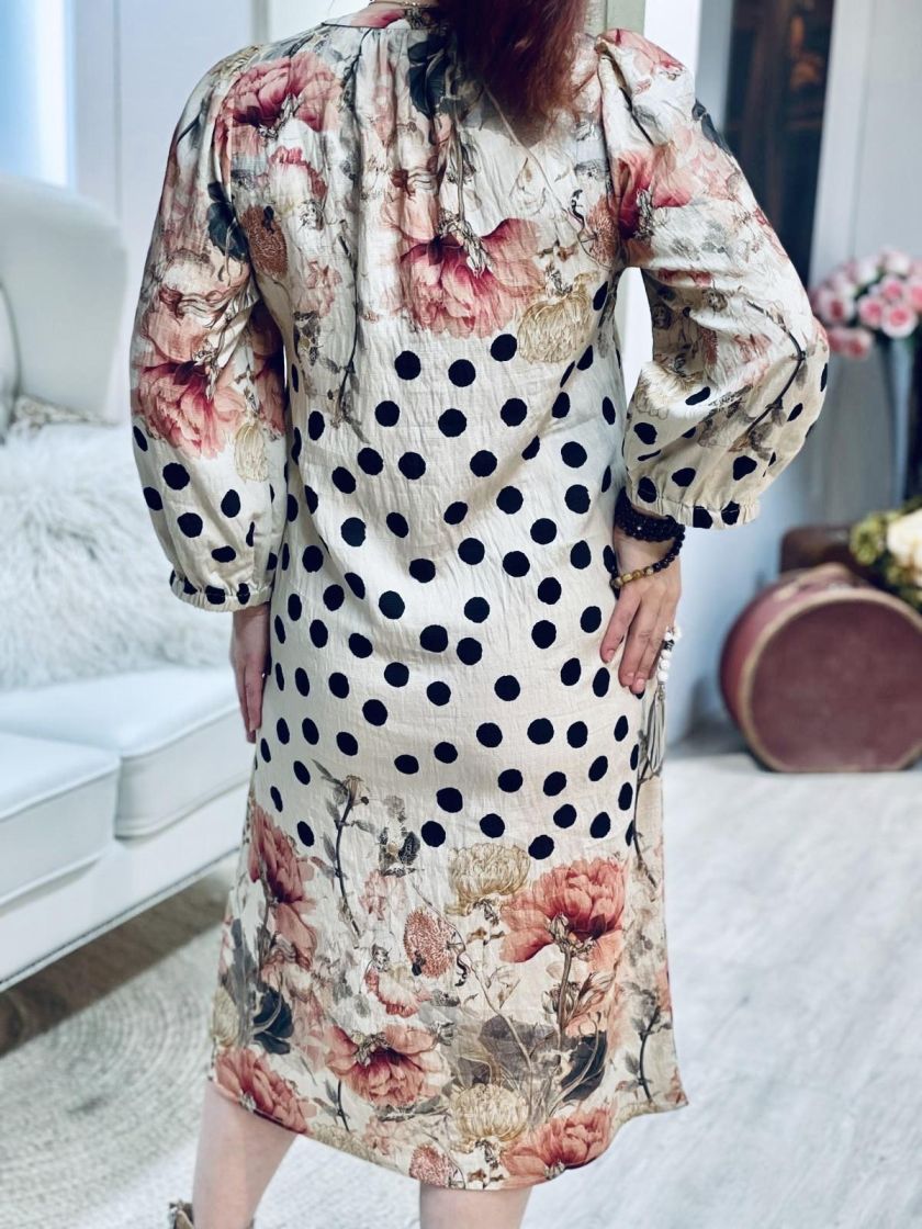 In Front mekko upealla kuosilla, jossa yhdistyy pallot ja kukat. Edessä pääntien alla on nappeja ja hihaan antaa ryhtiä kuminauha. Malli on suora. Materiaali on ohutta ja hieman siftaavaa viskoosisekoitetta.