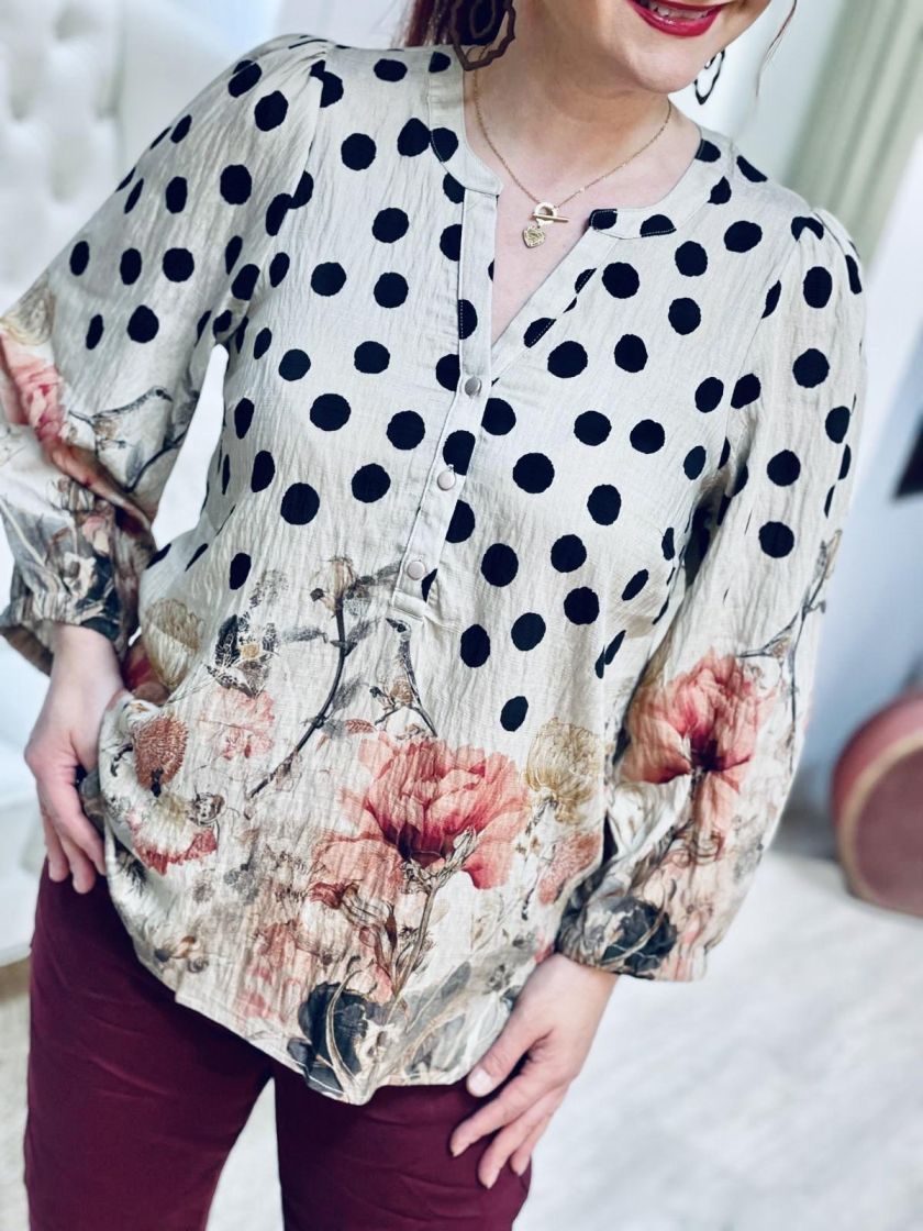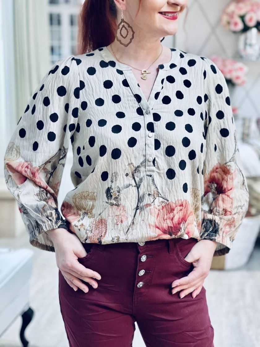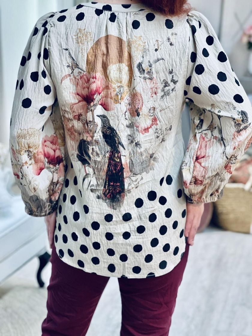 Upea kuosi! In Front pusero upealla kuosilla, jossa yhdistyy pallot, linnut ja kukat. Edessä pääntien alla on nappeja ja hihaan antaa ryhtiä kuminauha Helma hieman kaarrettu. Materiaali on hieman siftaavaa viskoosisekoitetta.