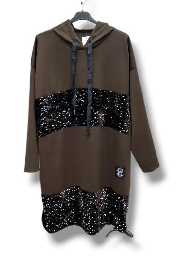 Plusmallistoa New Collection makea collegemekko hupulla. Mekossa kimaltaa kaksi reilua raitaa paljettikoristeista samettia. Helmaa voi kiristää nauhalla ja sivuilta löytyy taskut. Malli on suora ja väljä. Yhden koon malli noin 42-48 kokoisille. Mitoitus on reilu, joten tarkistathan mitat.