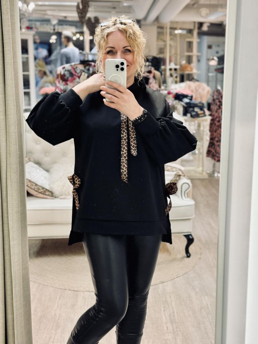 New Collection makea hupparitunika. Hupussa ilmettä antaa leonauhat ja sivuilla leorusetit. Mallissa on laskettu olkapää ja reilu pussihiha. Helma on takaa kivasti pidempi ja sivuja keventää halkiot. Materiaali on ohutta ja pehmeää sekä sisäpuoli kivan liukas. Yhden koon malli noin 38-44 kokoisille.