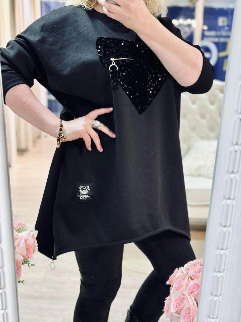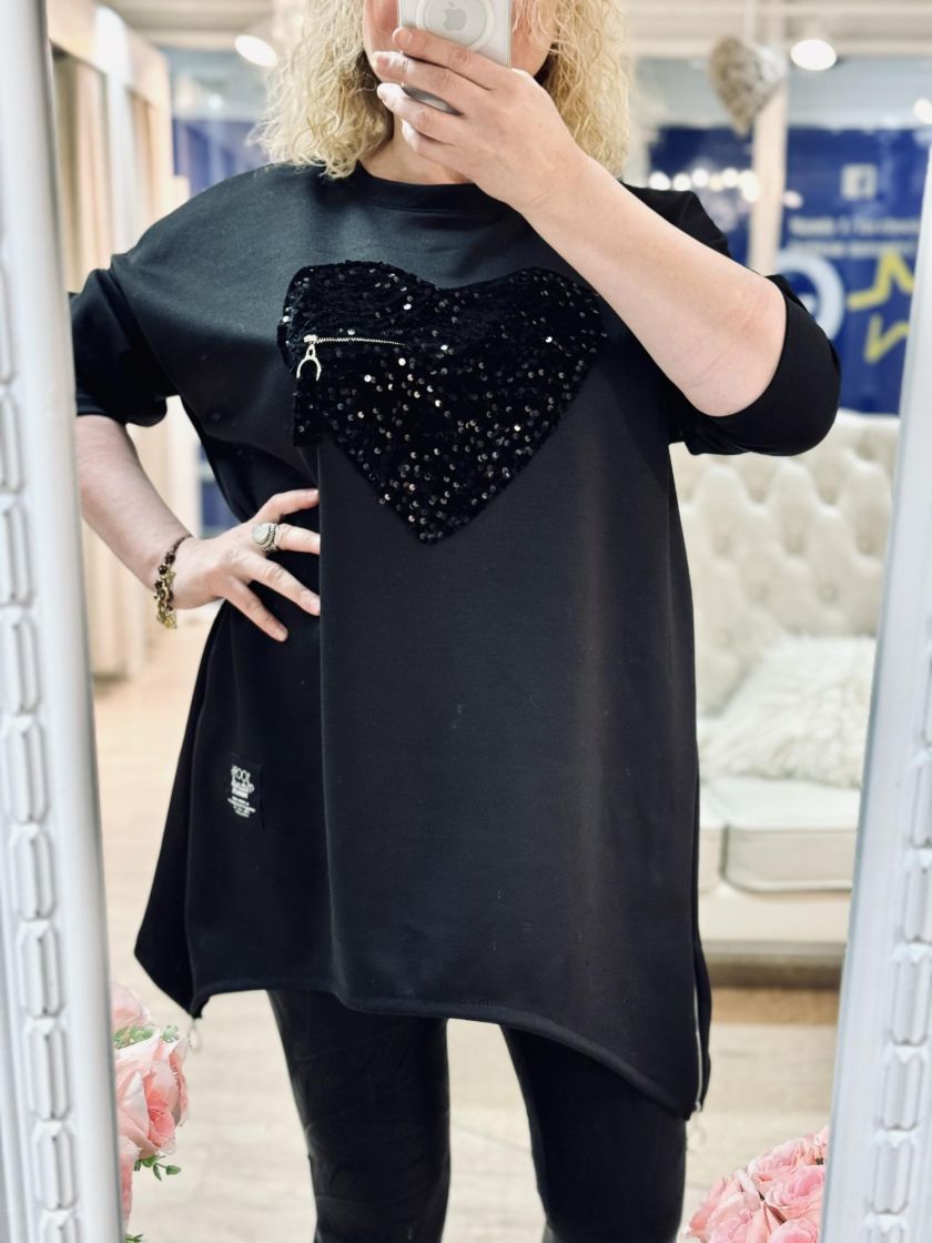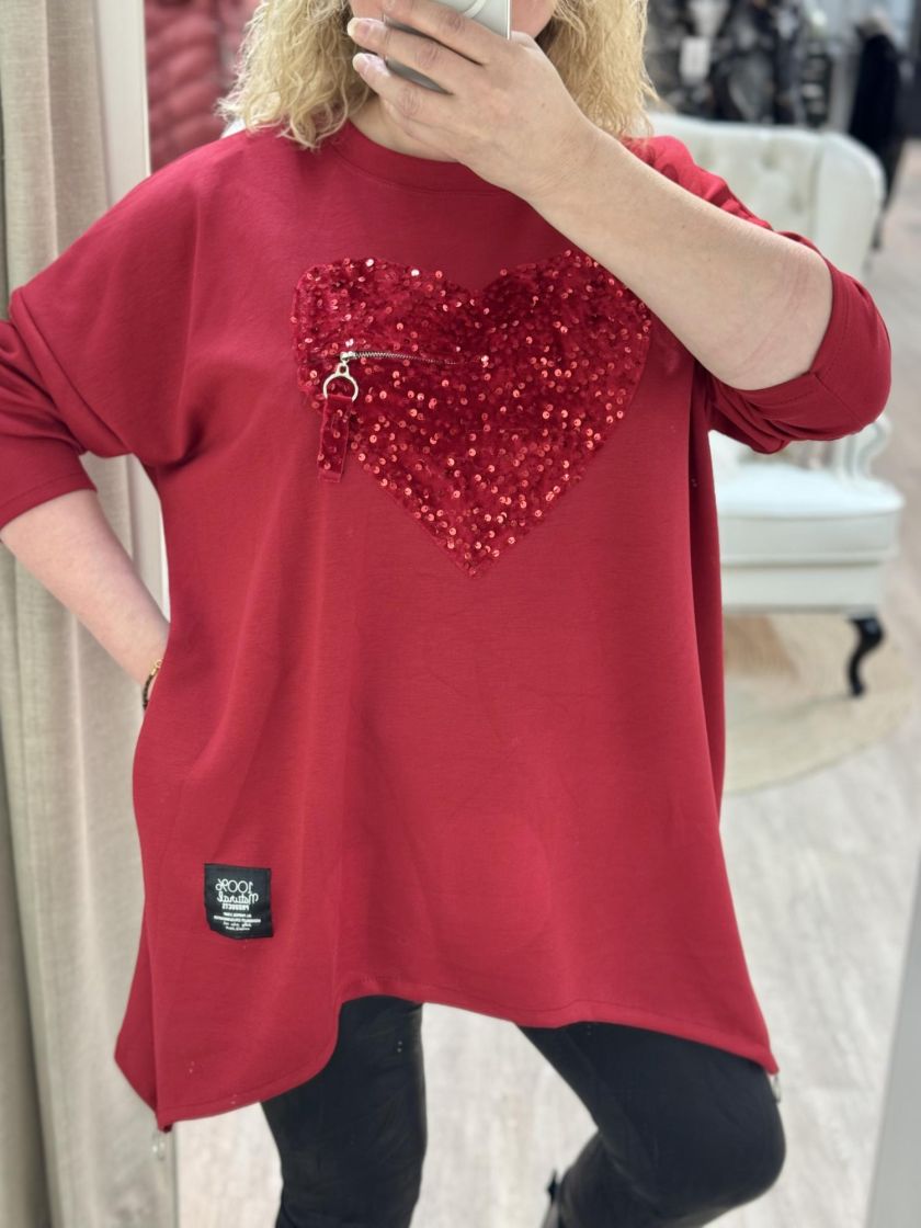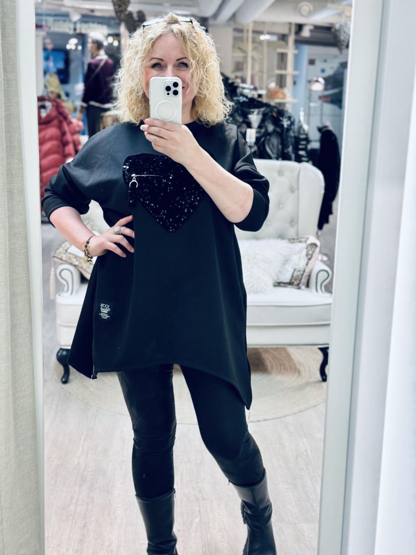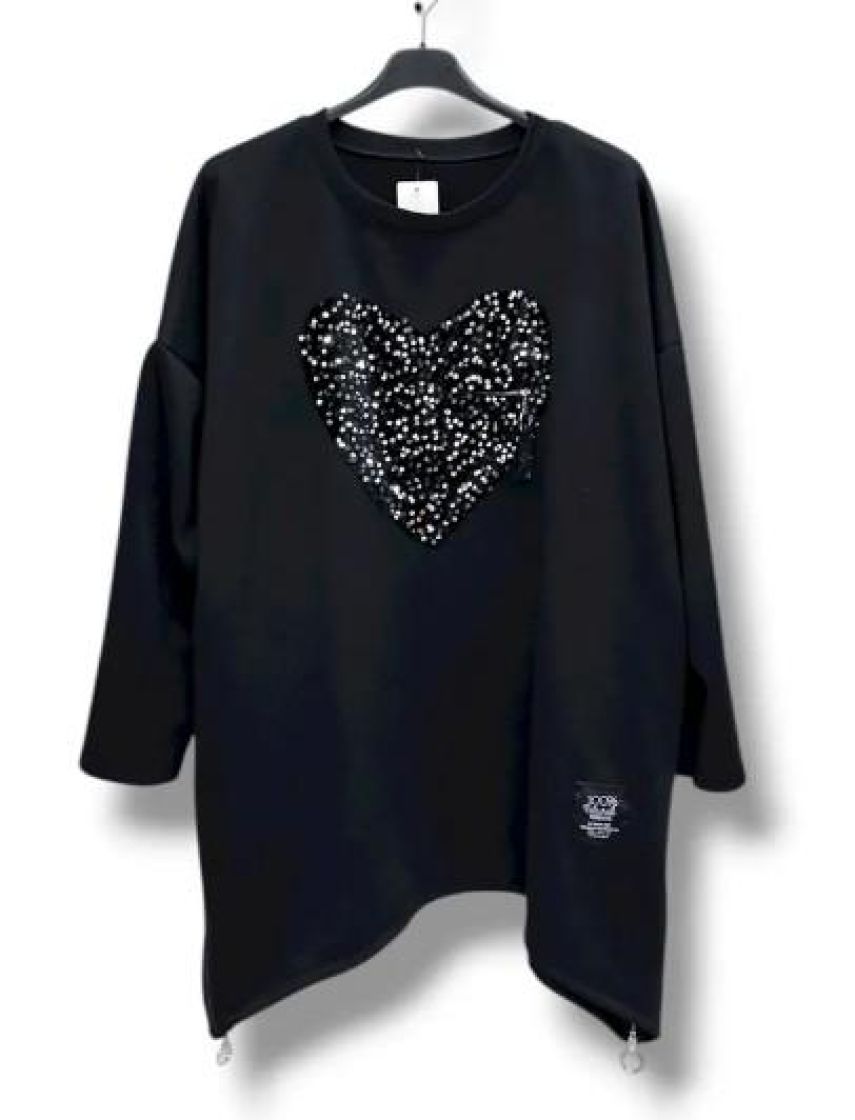 Plusmallistoa New Collection makea collegetunika. Jujuna on edessä vetoketjutaskulla sydän paljettikoristeista samettia. Helma on kivasti kaarrettu sivuilta pidemmäksi ja ilmettä antaa reilut vetoketjut sivuilla. Sivuilta löytyy myös taskut. Yhden koon malli noin 42-48 kokoisille. Mitoitus on reilu, joten tarkistathan mitat.