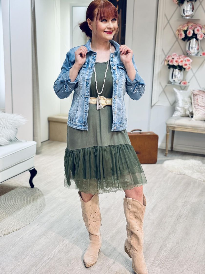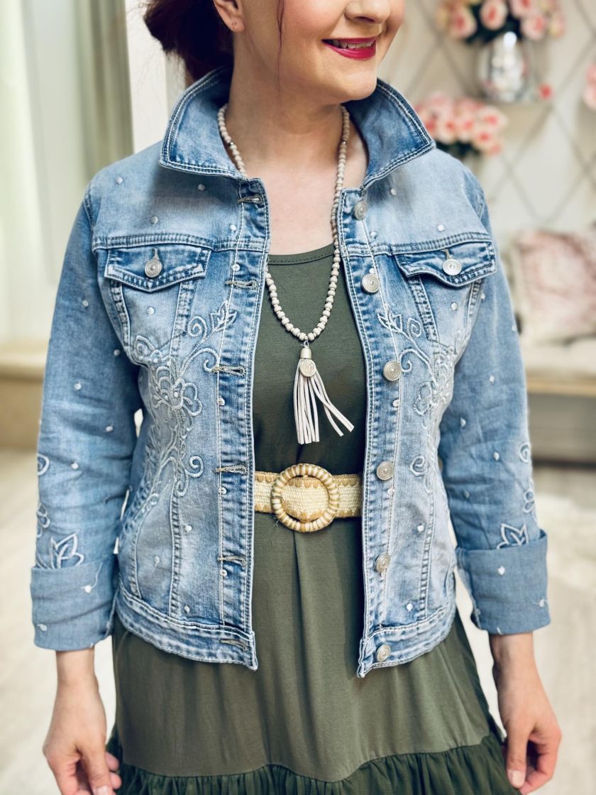 Tämä malli toimii nyt jakkuna ja kevään ja kesän tullen myös takkina. New Collection farkkujakku makeilla hopeisella brodeerauksella. Edessä on napitus, taskut ja läppätaskut. Materiaalina mukava puuvillasekoite. Klassinen malli kauluksella ja aavistuksen pidempi malli.