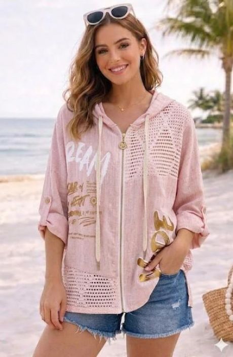 New Collection makee huppari-jakku mukavan ohutta ja kevyttä viskoosi-puuvillaa. Edessä kultatekstiä, läpinäkyvää verkkokangasta ja kimallelankaa. Helma on takaa hieman pidempi ja huppua voi kiristää nauhoilla. Yhden koon malli noin 38-42.Tarkistathan mitat.