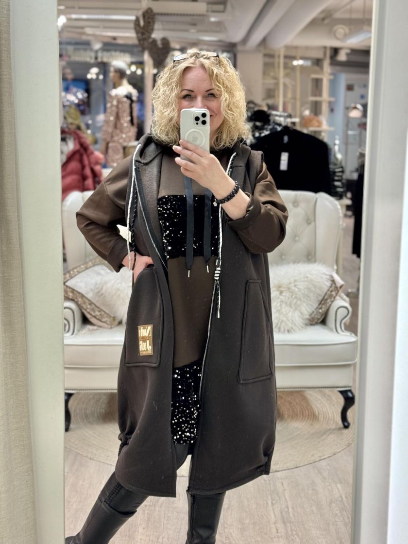 Plusmallistoa New Collection oversize huppuliivi kivaa collegea. Mallissa on huppu kiristysnauhoilla ja edessä reilut taskut, logomerkki sekä vetoketju. Helma on kauniisti kaarrettu ja sivuilla lisäilmettä antaa joustonauhat. Materiaali on hieman paksumpaa, pehmeää ja sisäpuoli todella pehmeä. Mitoitus on reilu ja malli hieman levenevä. Yhden koon malli noin 44-50 kokoisille.