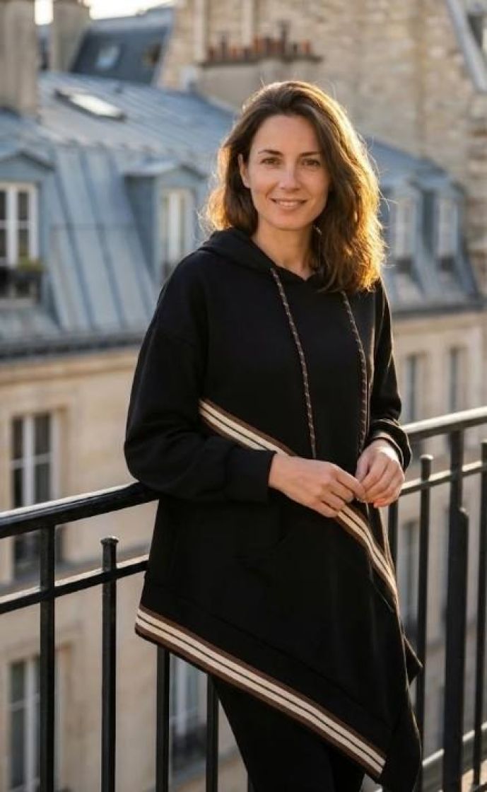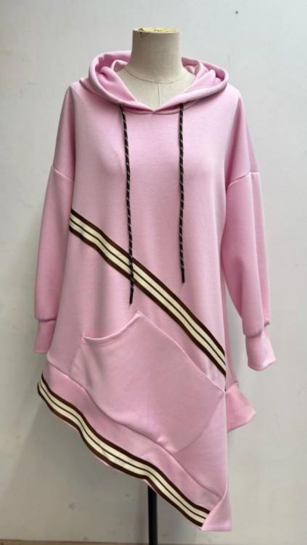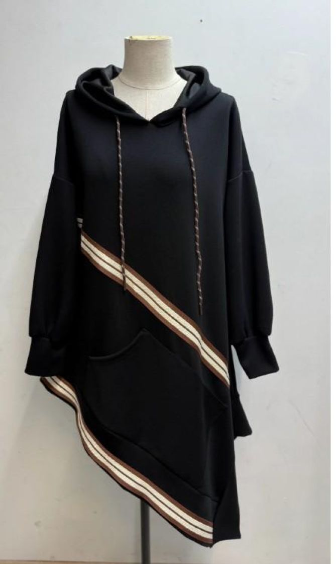 New Collection makea hupputunika. Tunikassa ilmettä antaa raitanauhat ja edessä vinottain tasku. Mallissa on laskettu olkapää ja reilu hiha, sekä hupussa raitakiristysnauhat. Helma on toiselta sivulta reilusti pidempi ja helma hieman levenevä. Materiaali on ohutta ja pehmeää sekä sisäpuoli kivan liukas. Yhden koon malli noin 38-44 kokoisille.