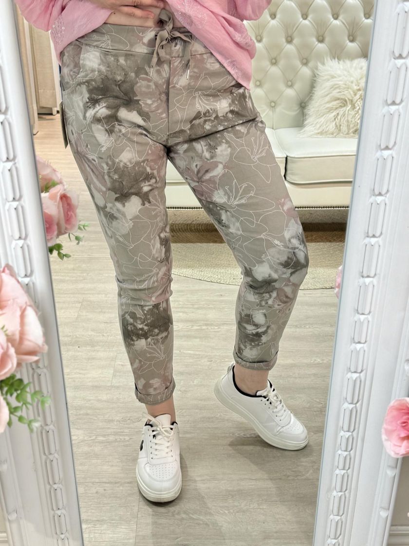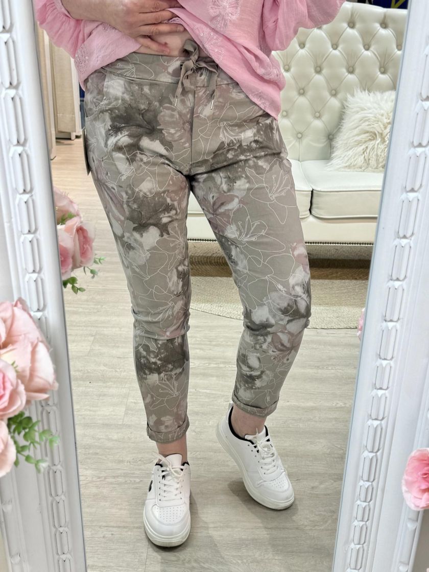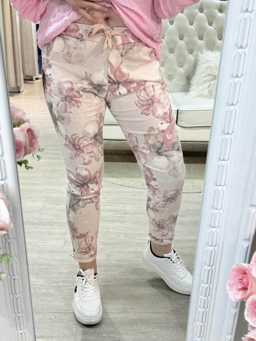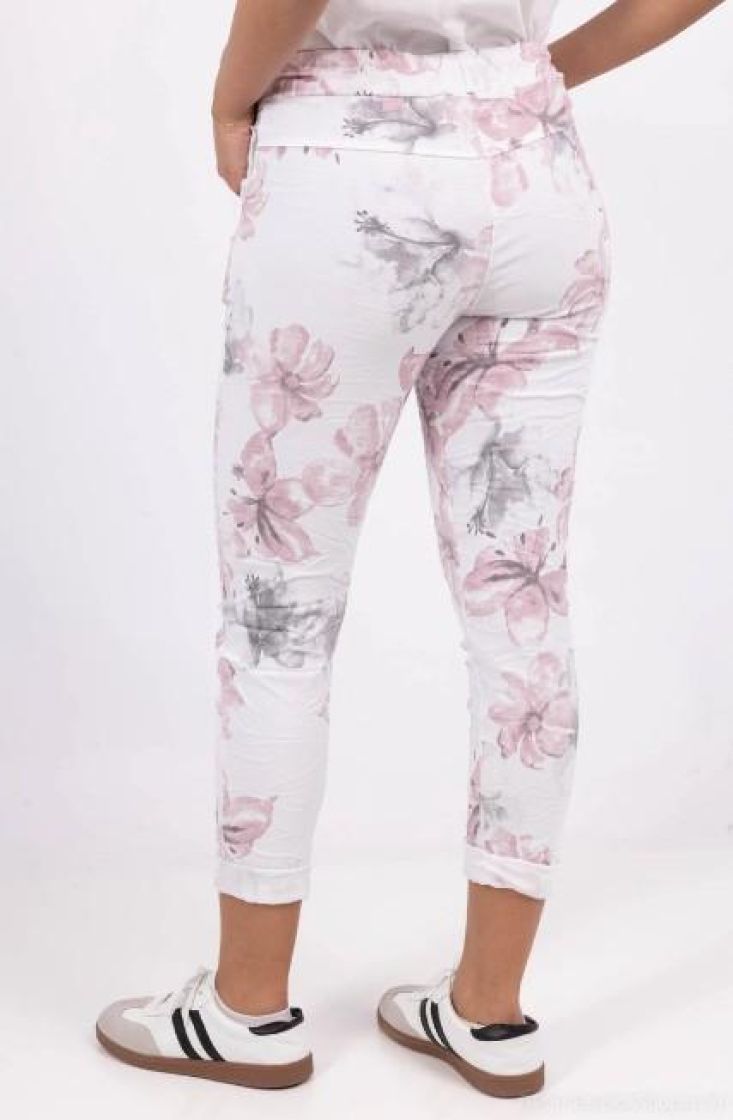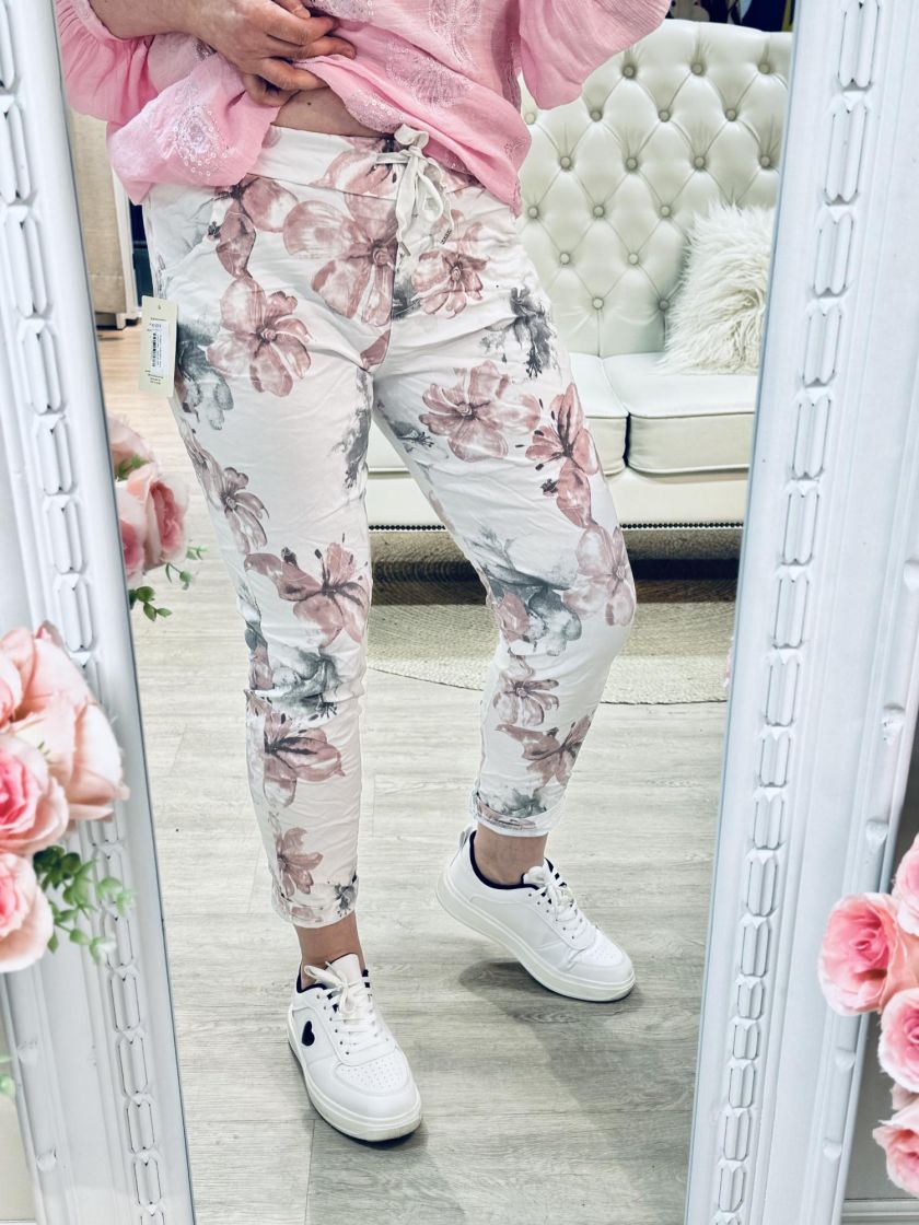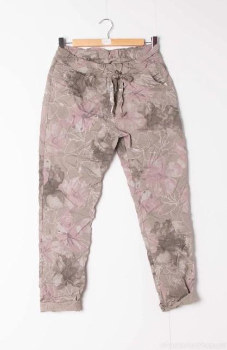 New Collection kivat kukkajoggerit. Mukavuuden takaa joustava kuminauhavyötärö kiristysnauhoilla ja lahkeen pituutta voi säätää kääntämällä. Edestä löytyy taskut. Materiaali on kivan ohut ja todella joustava puuvillacollege. Yhden koon malli noin 36-42 kokoisille.