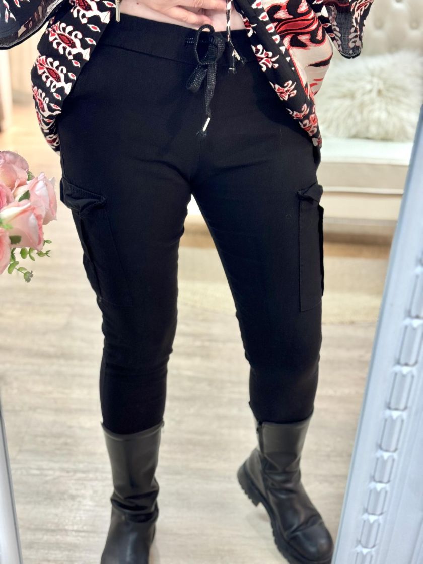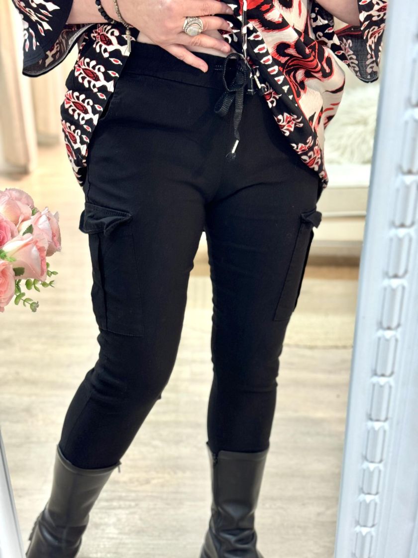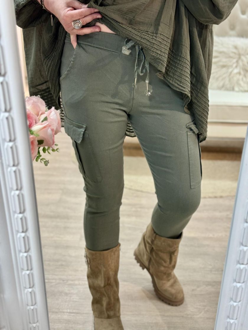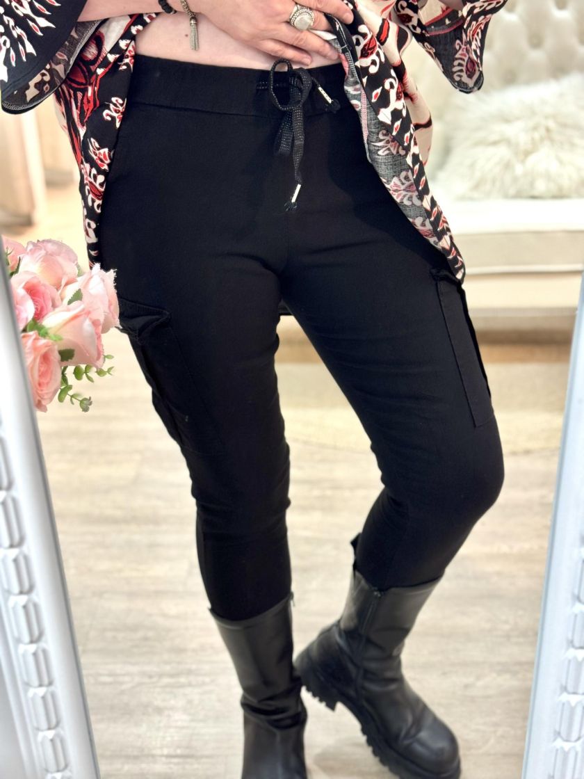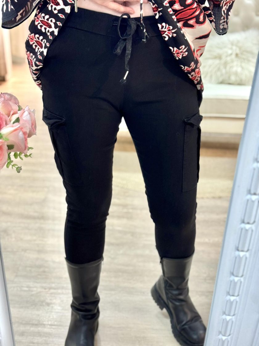 New Collection joggerit reiluilla reisitaskuilla. Mukavuuden takaa joustava kuminauhavyötärö kimaltavilla kiristysnauhoilla ja lahkeen pituutta voi säätää kääntämällä. Edestä löytyy taskut ja sivuilla on reilut reisiläppätaskut. Materiaali on kivan ohut ja todella joustava viskoosisekoite. Yhden koon malli noin 38-42(44) kokoisille.
