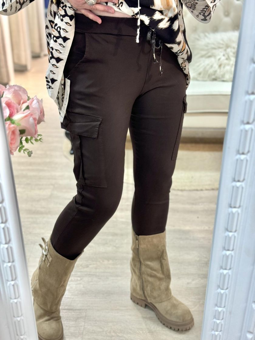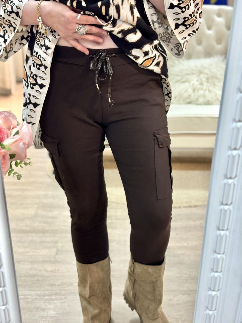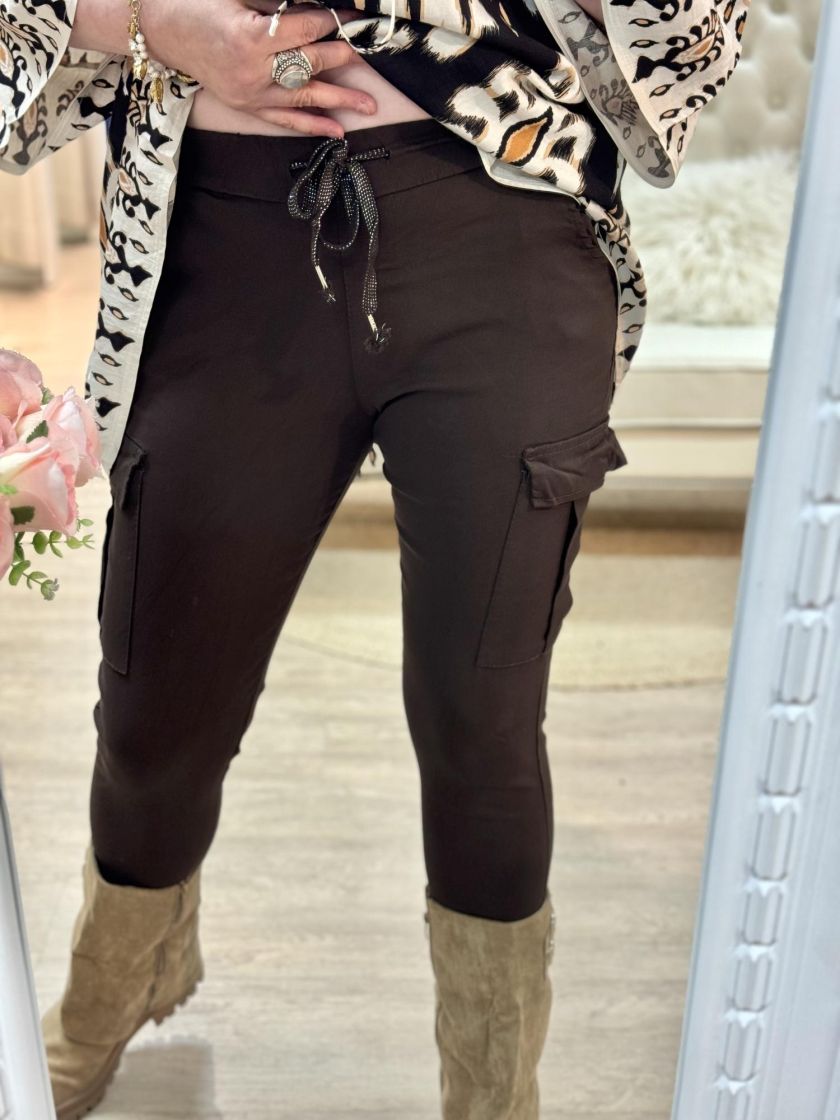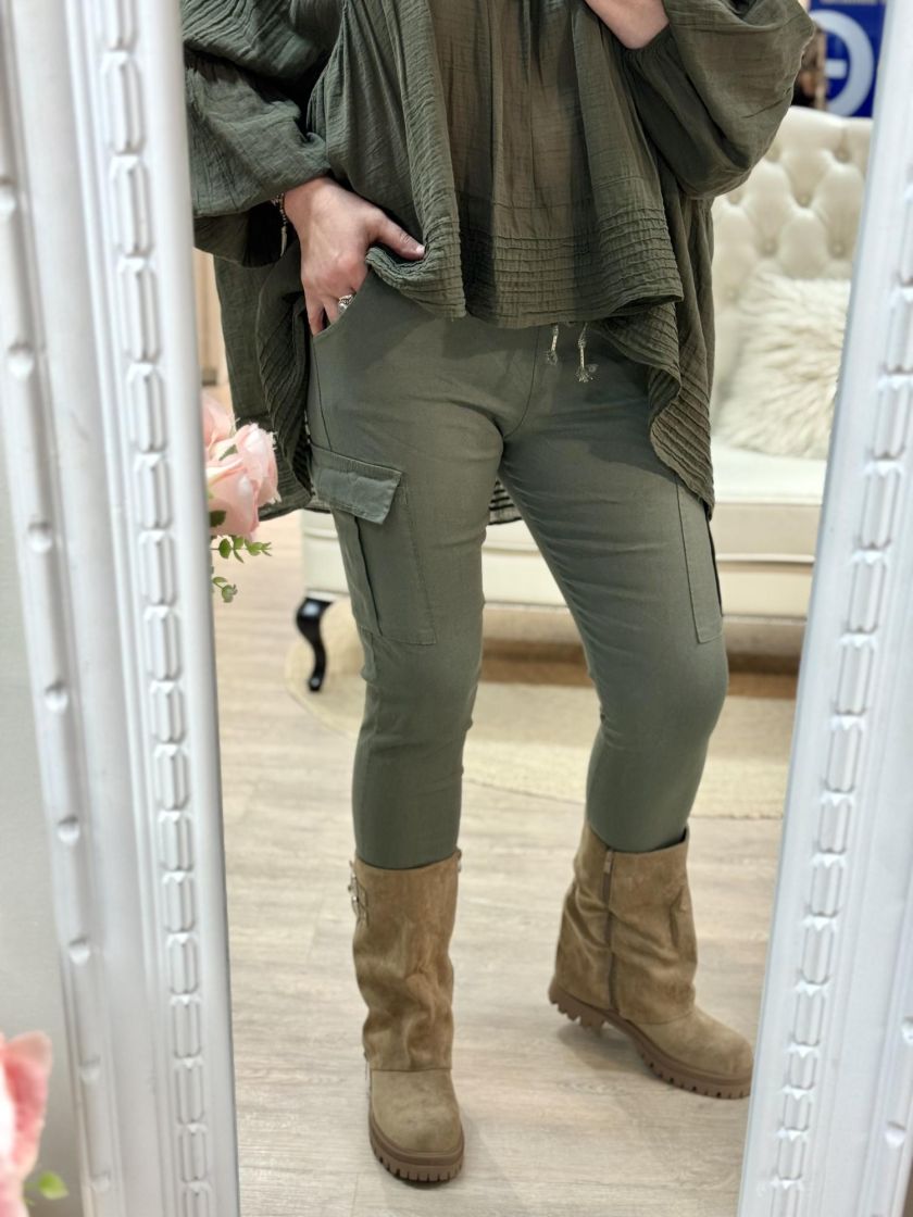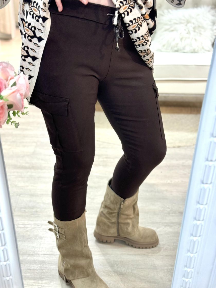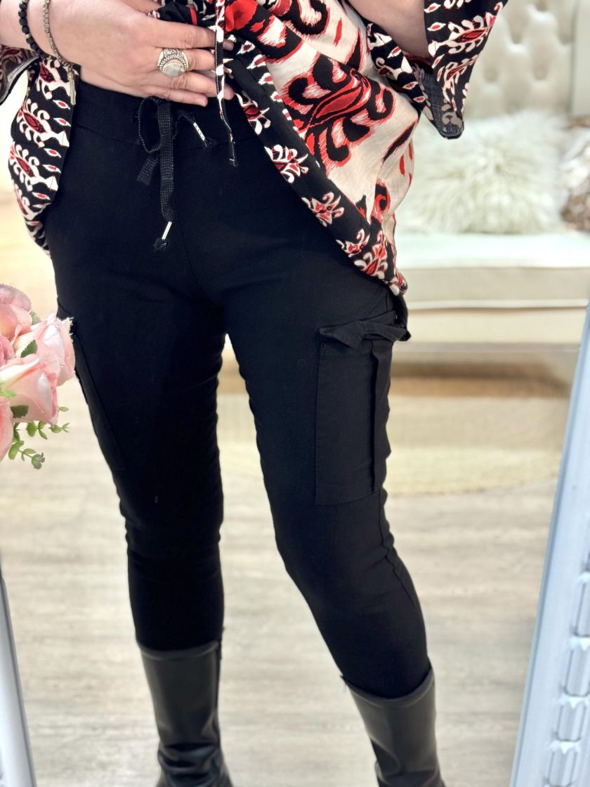 New Collection joggerit reiluilla reisitaskuilla. Mukavuuden takaa joustava kuminauhavyötärö kimaltavilla kiristysnauhoilla ja lahkeen pituutta voi säätää kääntämällä. Edestä löytyy taskut ja sivuilla on reilut reisiläppätaskut. Materiaali on kivan ohut ja todella joustava viskoosisekoite. Yhden koon malli noin 38-42(44) kokoisille.