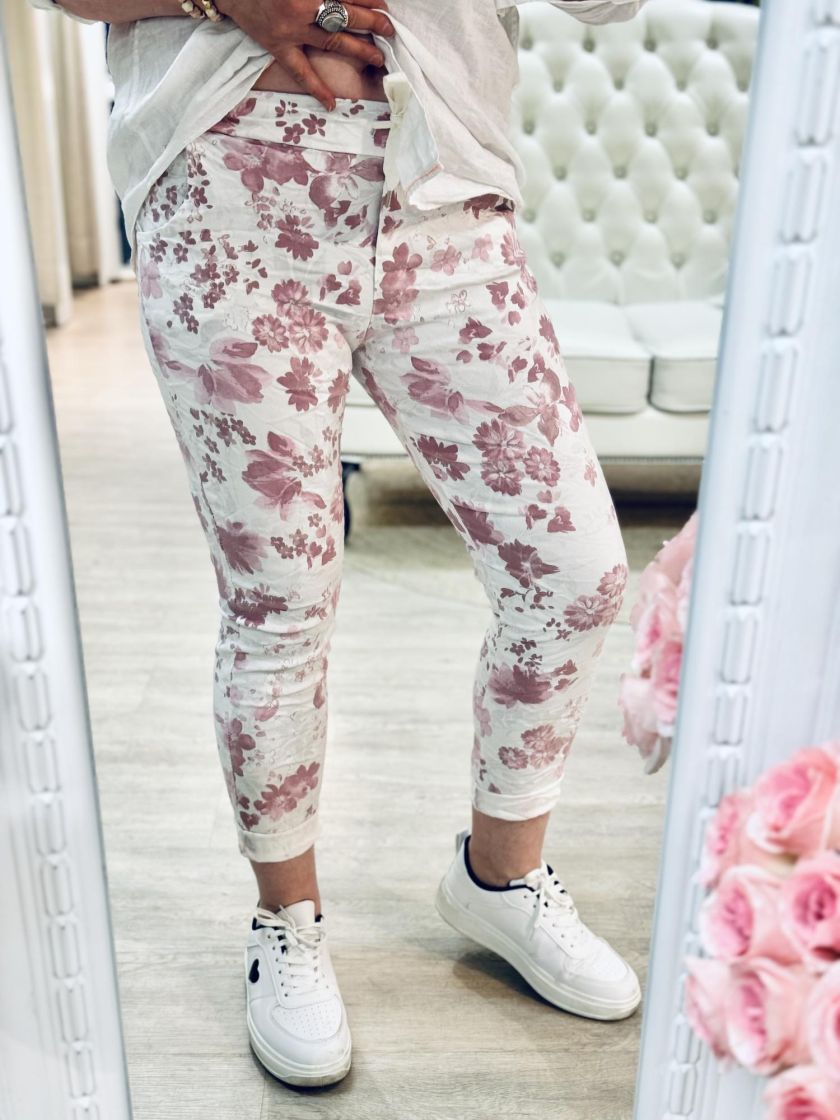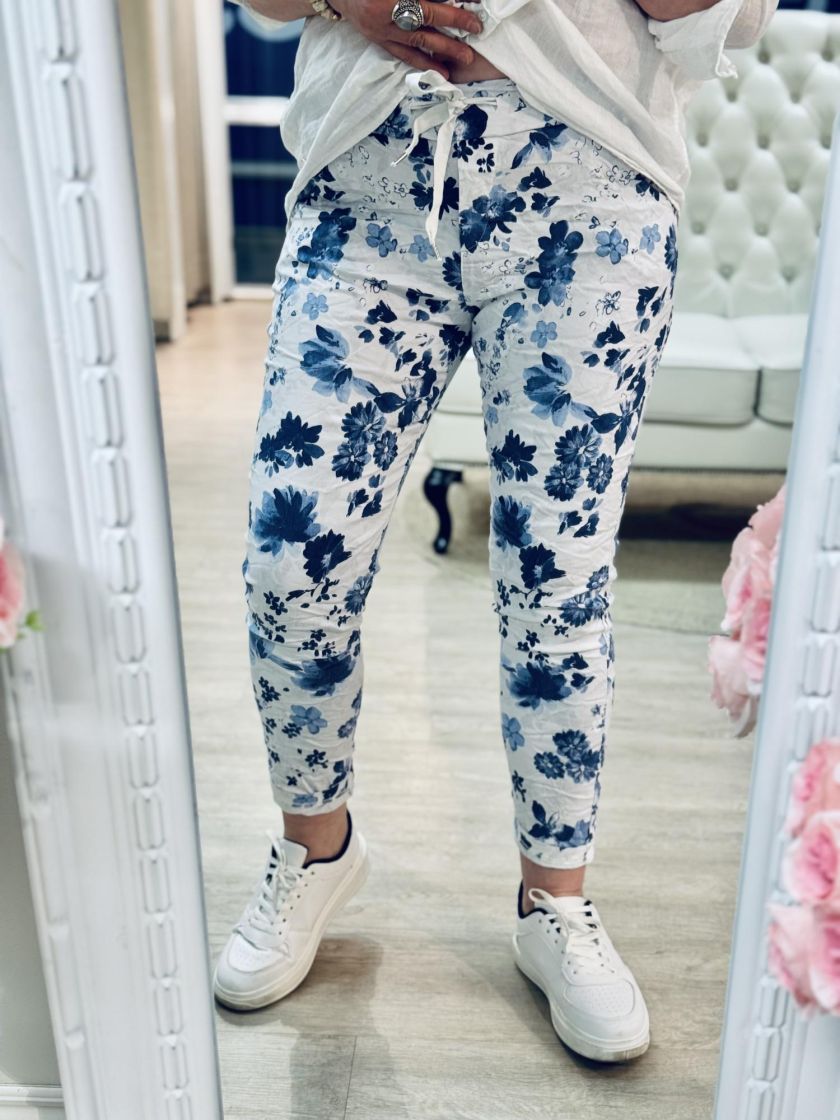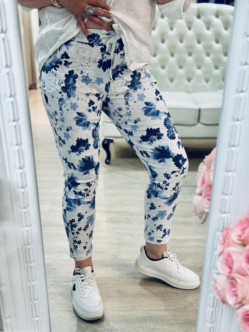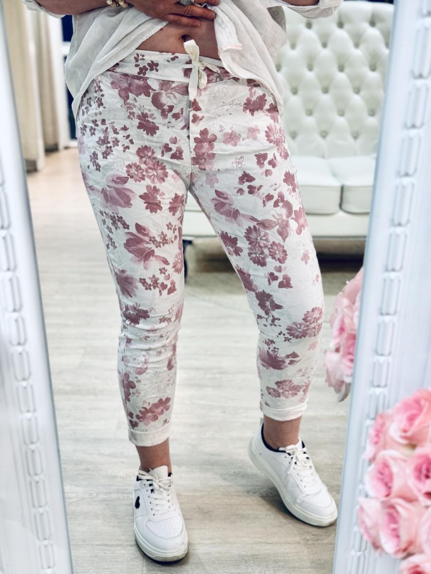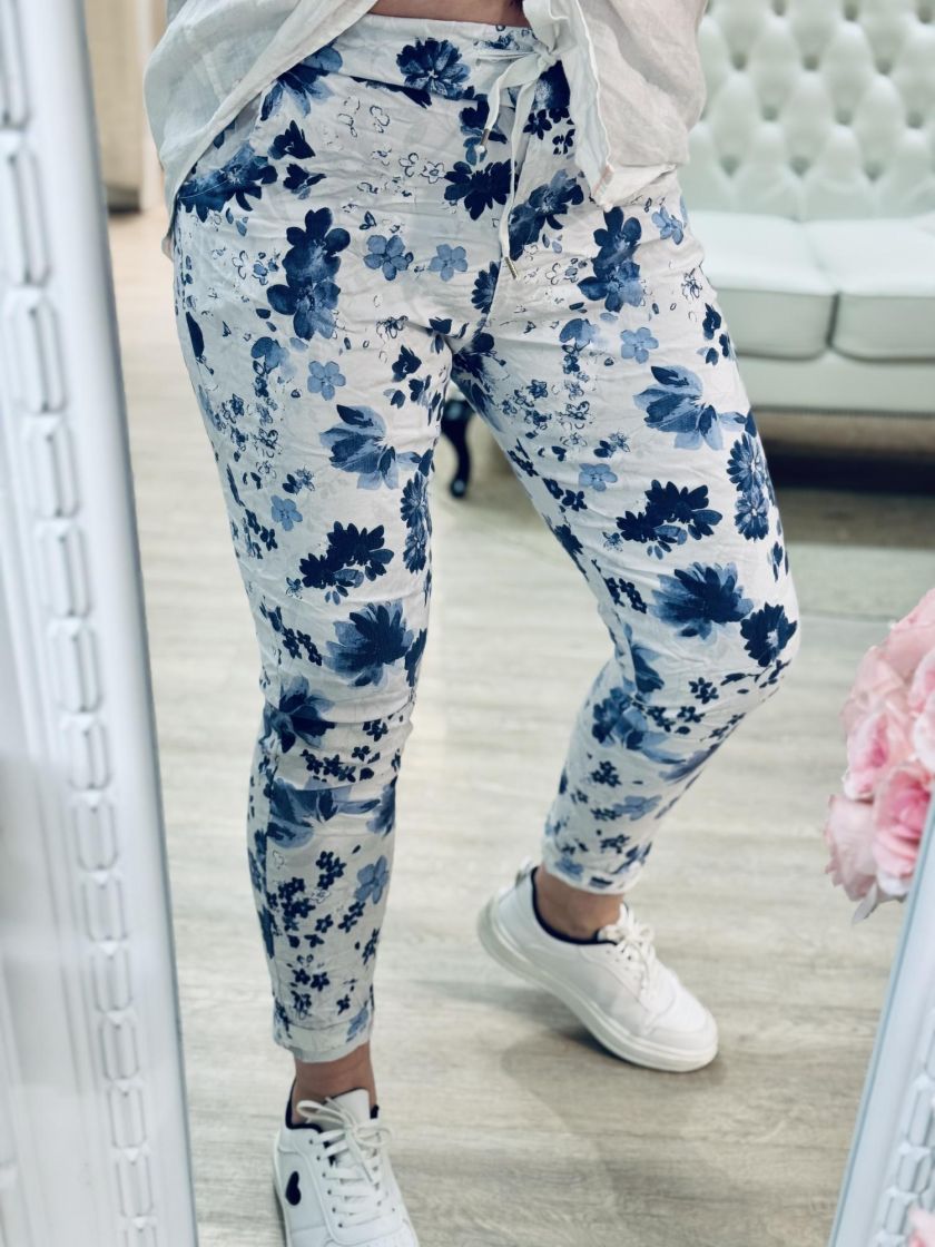 New Collection kivat kukkajoggerit. Mukavuuden takaa joustava kuminauhavyötärö kiristysnauhoilla ja lahkeen pituutta voi säätää kääntämällä. Edestä löytyy taskut. Materiaali on kivan ohut ja joustavaa viskoosisekoitetta. Tarkastathan mitat.