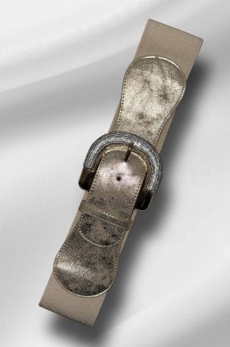 New Collection leveä joustovyö. Vyössä on näyttävä kullankimaltava strassisolki ja väreinä musta-kulta sekä beige-kulta. Vyö sopii noin 34-40 kokoisille.