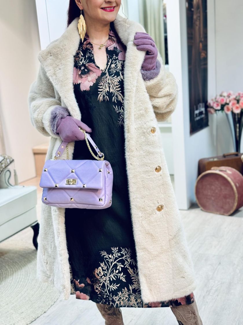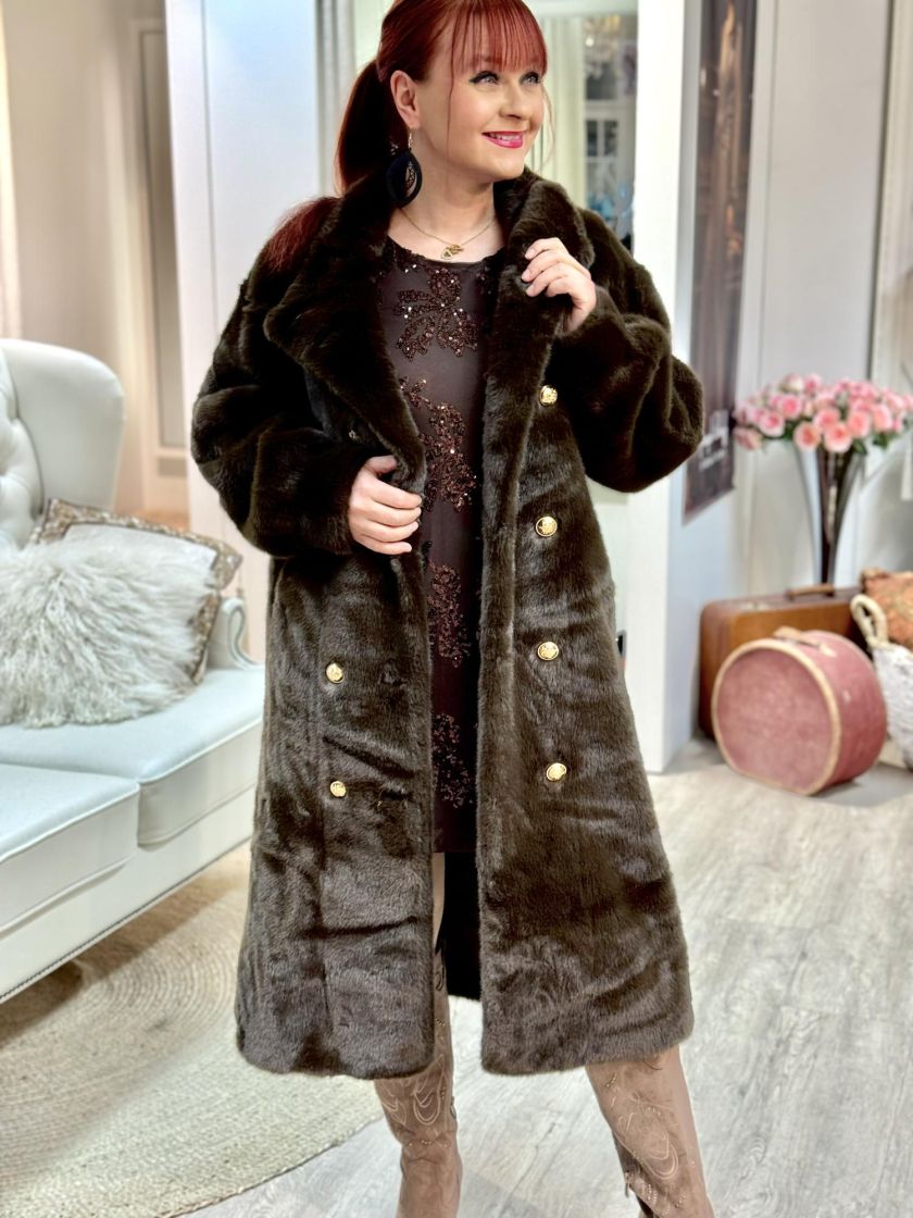 New Collection ihanan pörröinen ja pehmeä keinokarvatakki. Takin kiinnitys on näyttävillä kullanvärisillä napeilla. Kaulus on kauniisti nouseva ja sen voi myös kääntää. Hihansuussa ryhtiä antaa kaitale ja edestä löytyy taskut. Takissa ei ole vuorta. Malli on suora ja mitoitus siro, tarkistathan mitat.