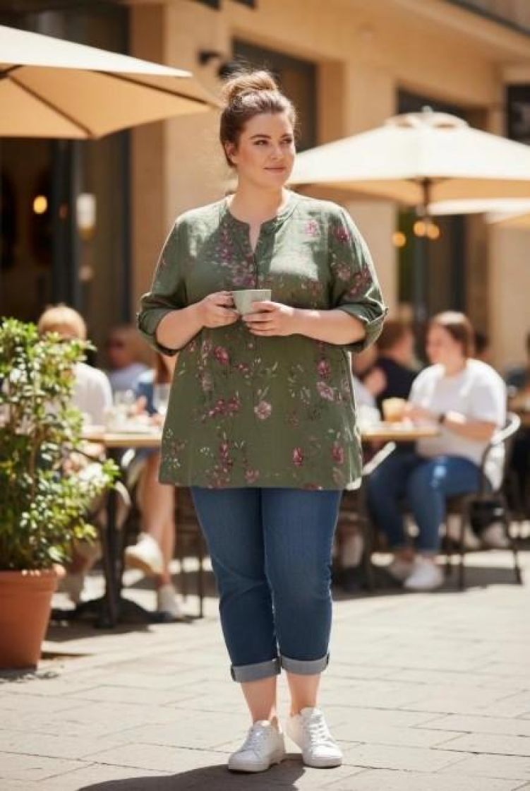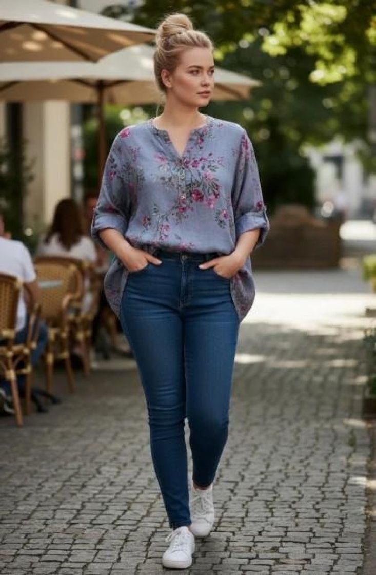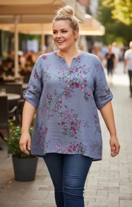 Plusmallisto New Collection sievä kukkapusero mukavan ohutta pellavaa. Edessä pääntien alla napit ja hihaa voi kääntää napin avulla. Malli on yhden koon ja vastaa n. 42-46 kokoa. Tarkastathan mitat.