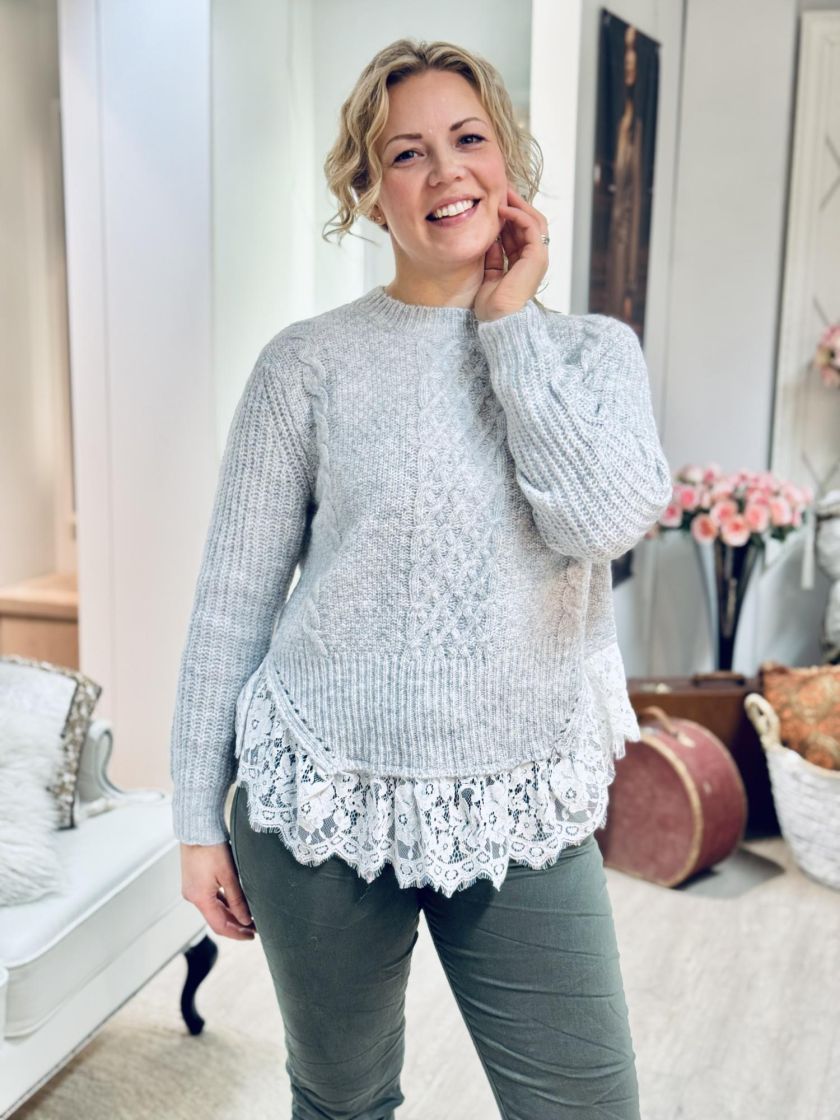 New Collection pehmeä ja pörröinen neulepusero. Puserossa on upea pitsihelma ja kivasti yhdistetty erilaisia neuloksia. Materiaali on kauniisti meleerattu. Yhden koon malli noin 36-42 kokoisille.