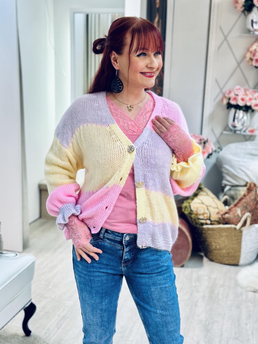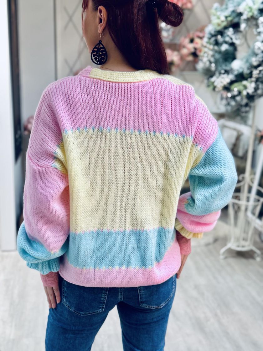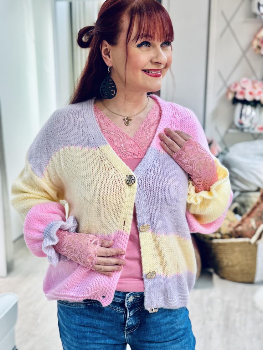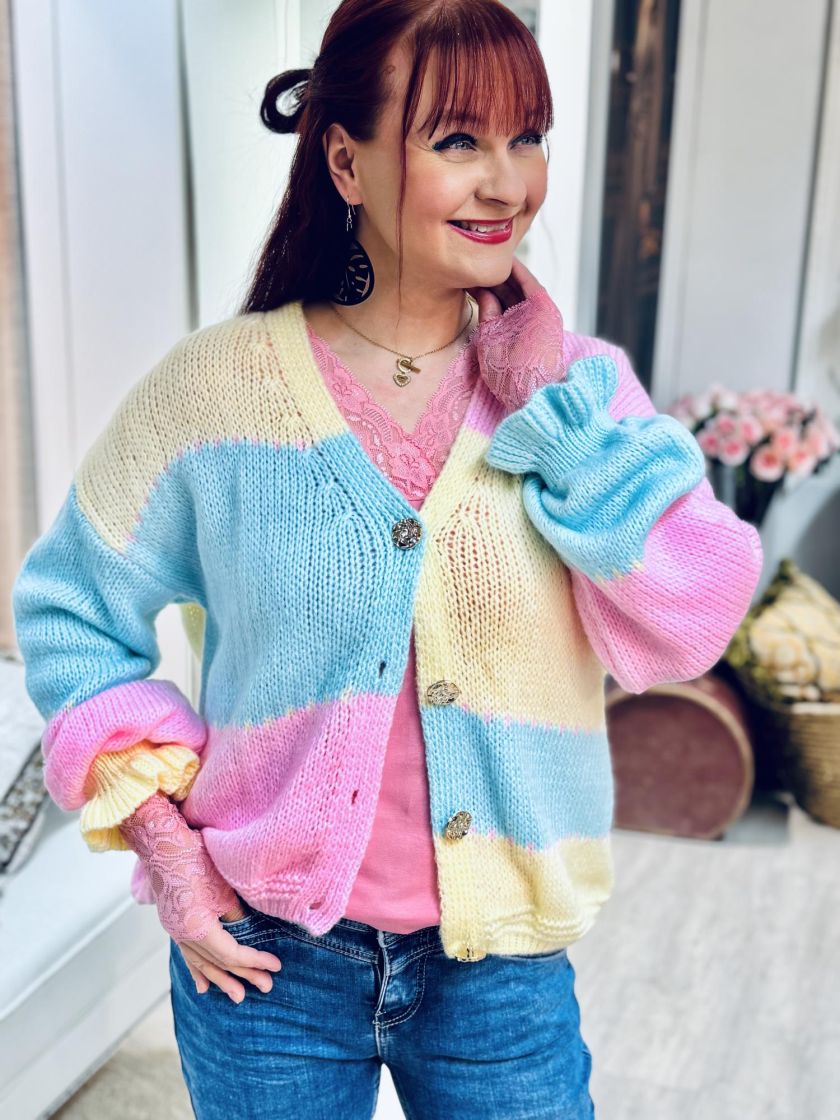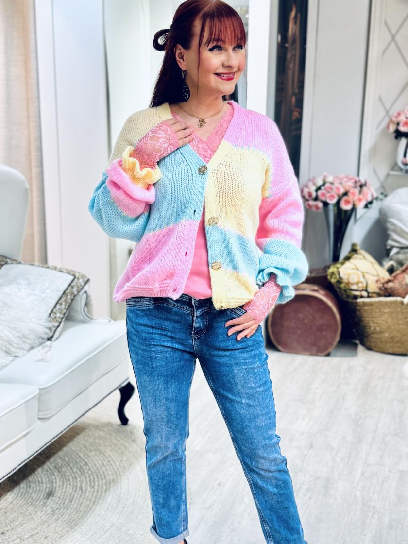 New Collection superpehmeä neuletakki ihanan värikkäillä ruuduilla. Edessä on napitus reiluilla kullanvärisillä napeilla ja hihansuussa kiva frilla. Yhden koon malli noin 38-44 kokoisille.