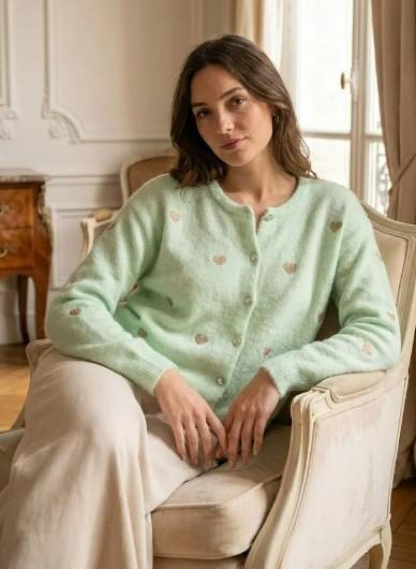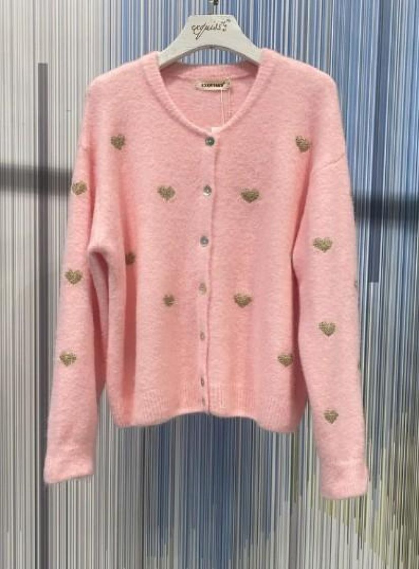 New Collection pörröinen ja superpehmeä neuletakki. Edessä on napitus helmiäisnapeilla ja söpöjä sydämiä kultalangasta. Sydämet löytyy myös hihoista. Ryhtiä tuo resorit pääntiellä, helmassa ja hihansuussa. Yhden koon malli noin 38-42 kokoisille.