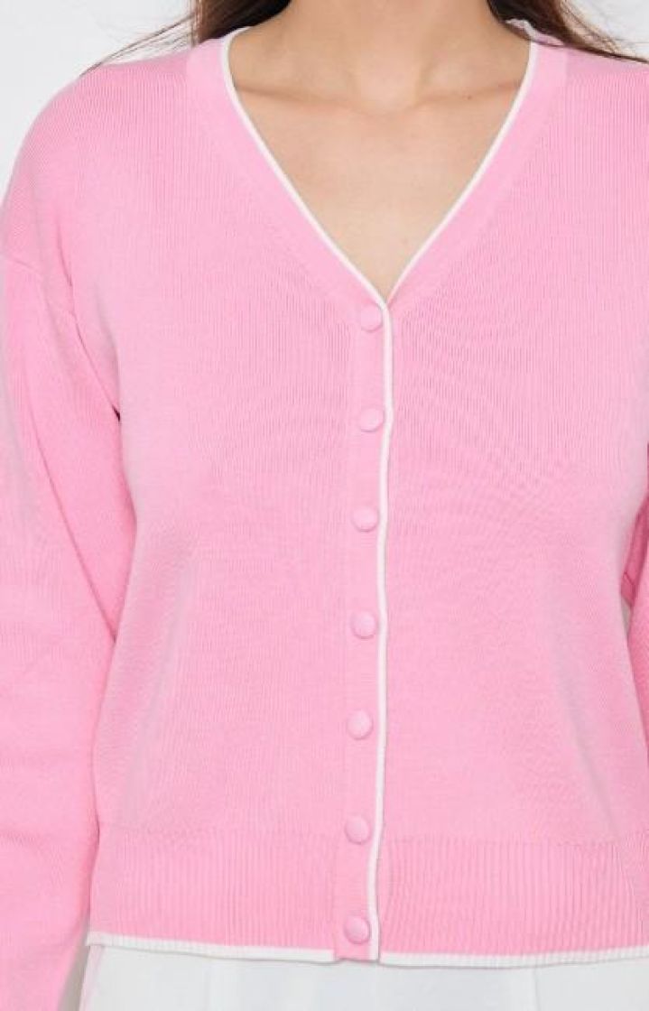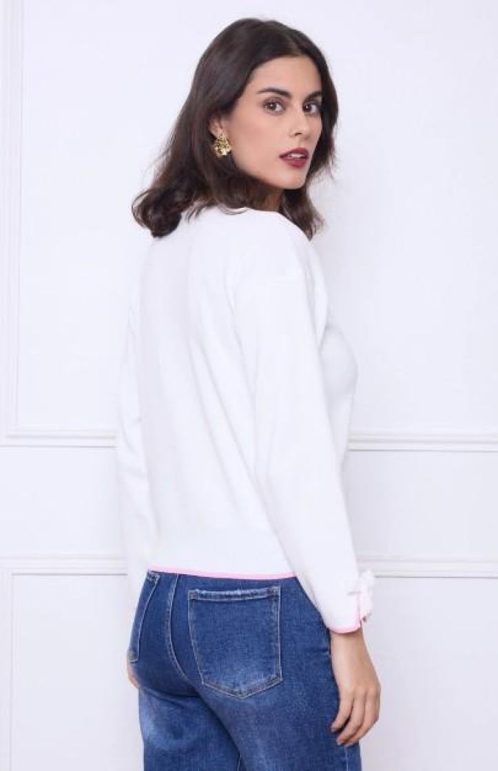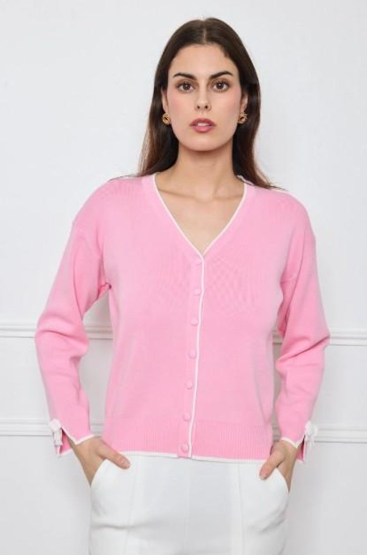 New Collection neuletakki söpöillä rusettihihoilla. Rusetit on pehmeää samettia ja hihansuuta keventää lisäksi halkiot. Edessä on napitus ja kapeat raidat kiertää pääntien, etureunan, helman ja hihasuun. Neulos on ohutta ja sileää viskoosisekoitetta. Malli on siro ja mitoitus pieni, joten tarkistathan mitat.