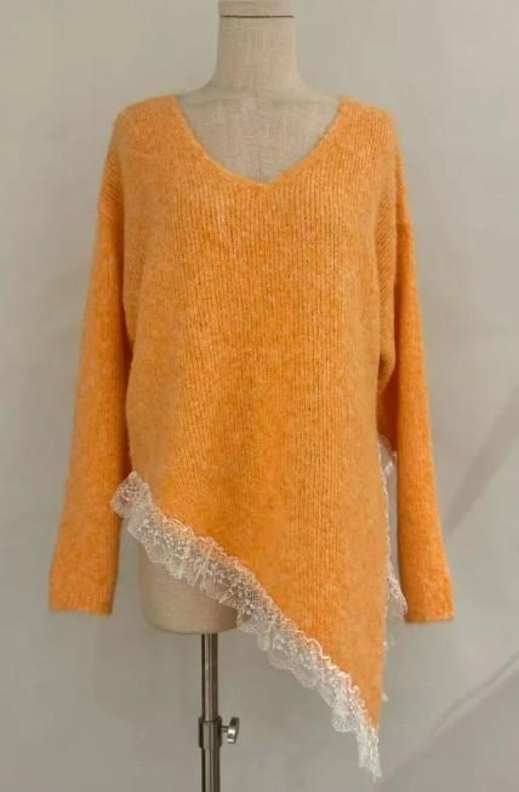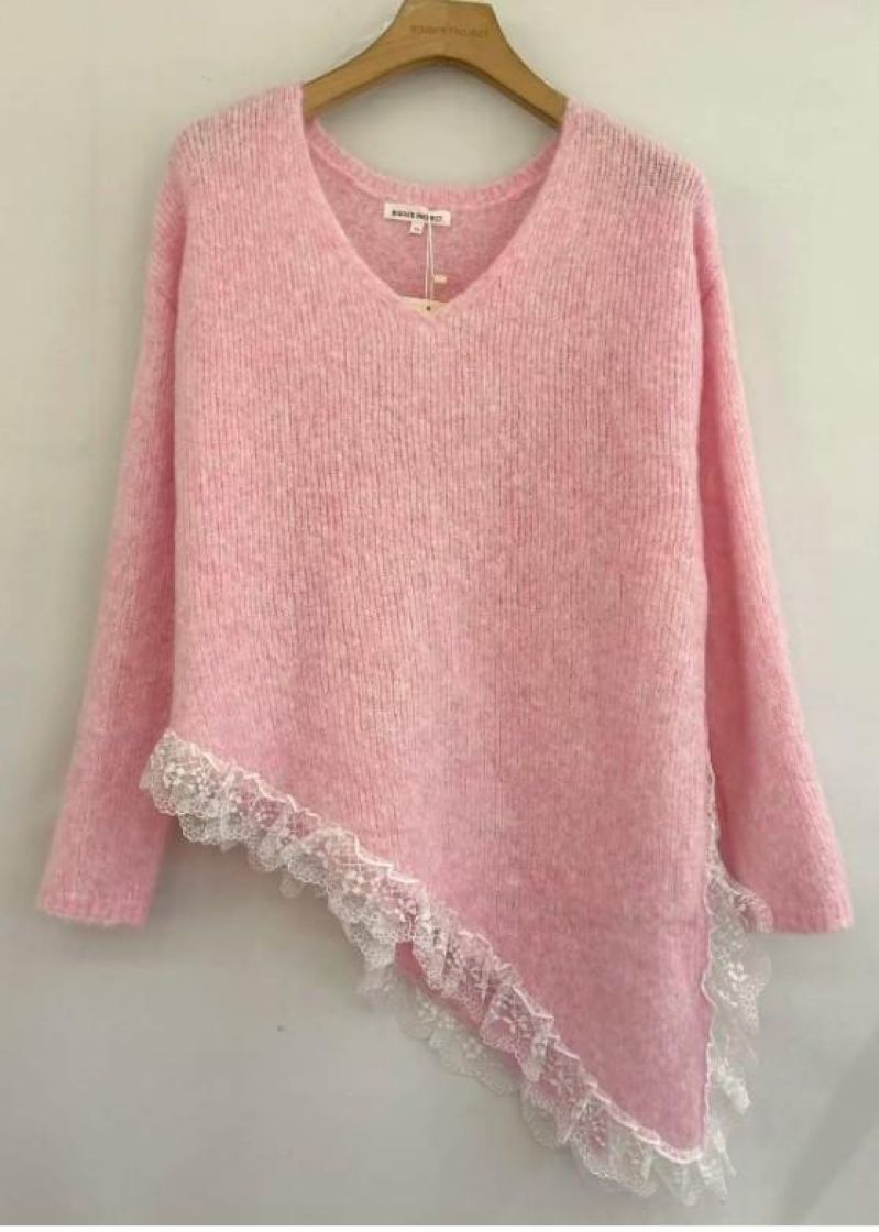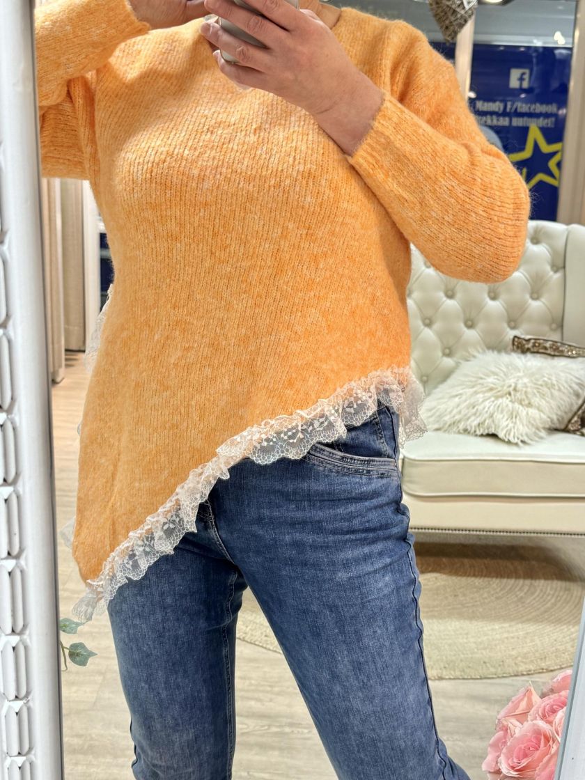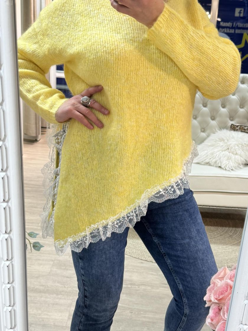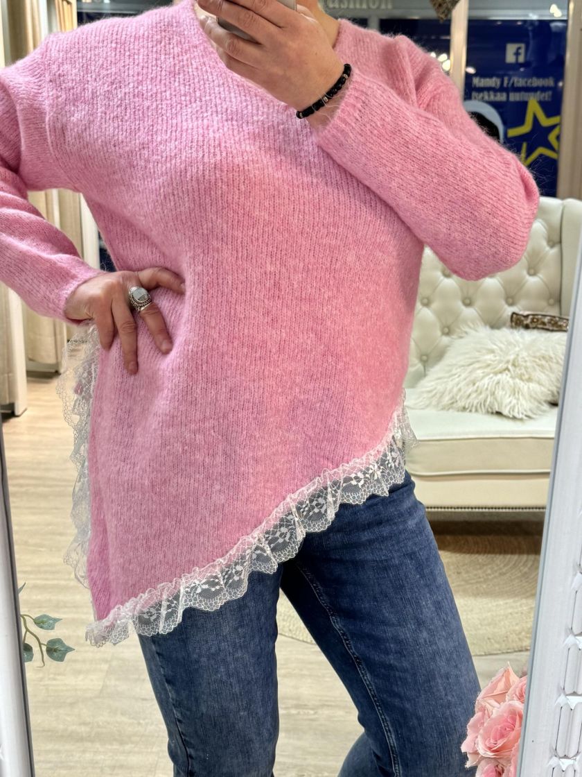 New Collection pehmeä ja pörröinen neuletunika/pusero. Puserossa on vinohelma ja kaunis pitsi helmassa. Mallissa on reilu v-pääntie ja neulos kivasti meleerattua. Yhden koon malli noin 38-42 kokoisille.