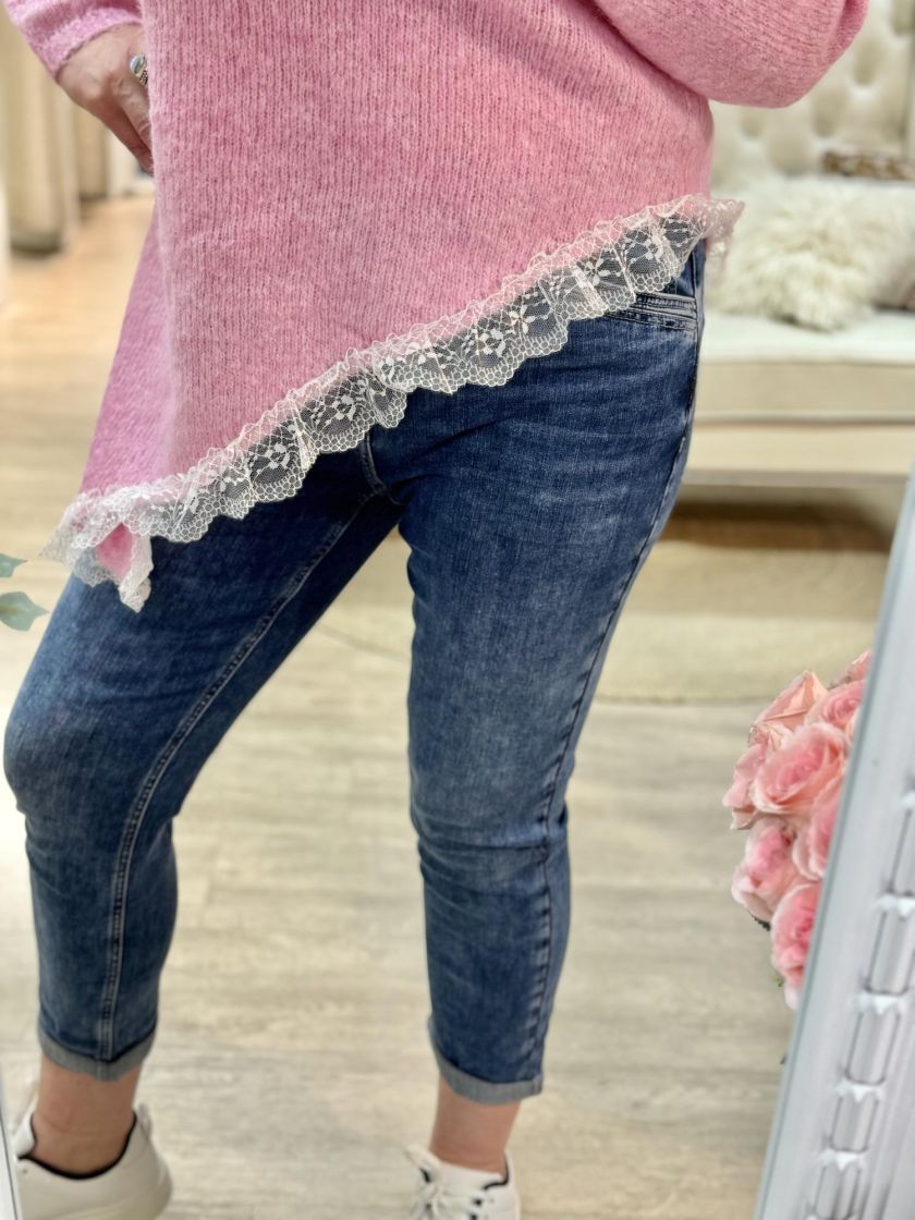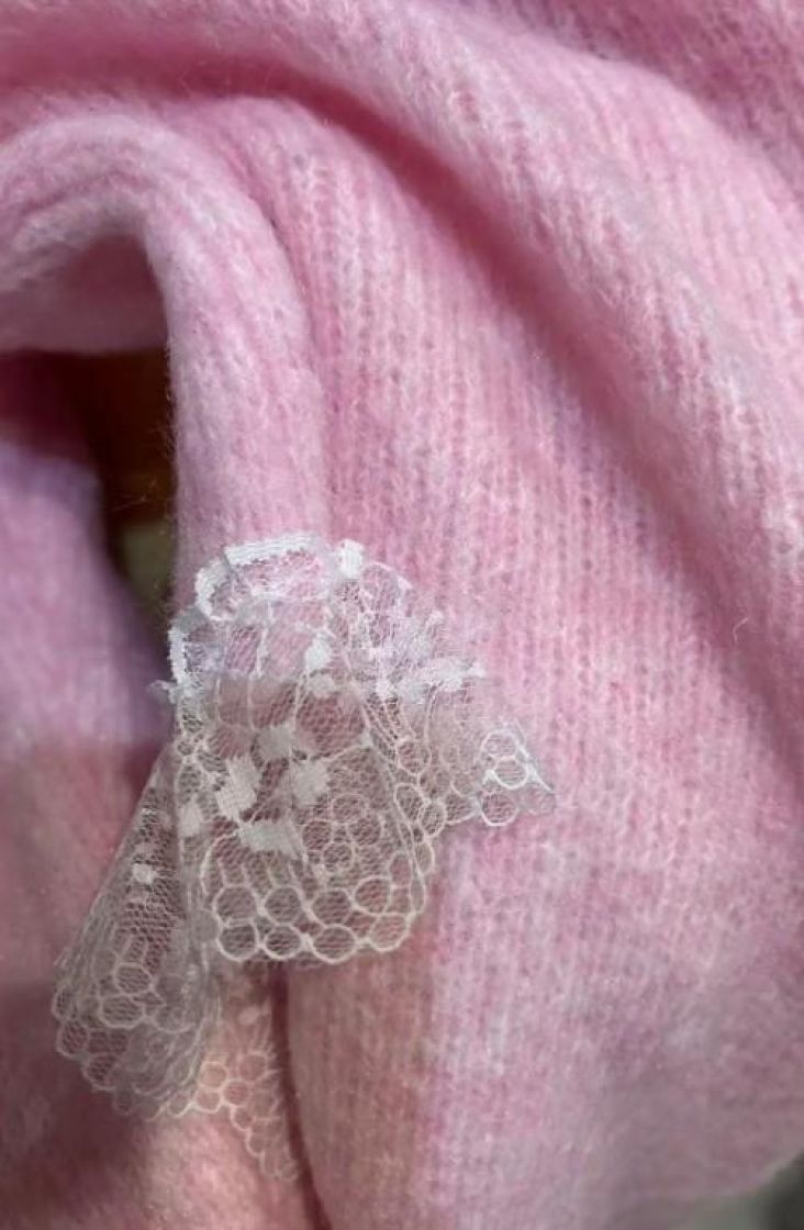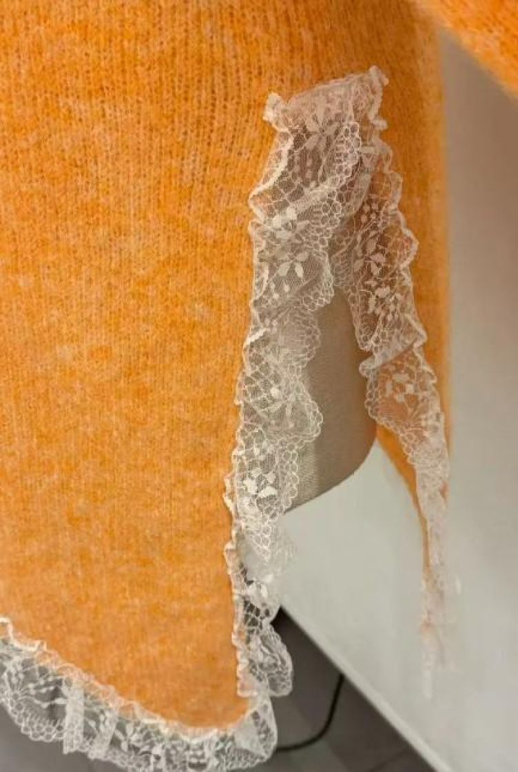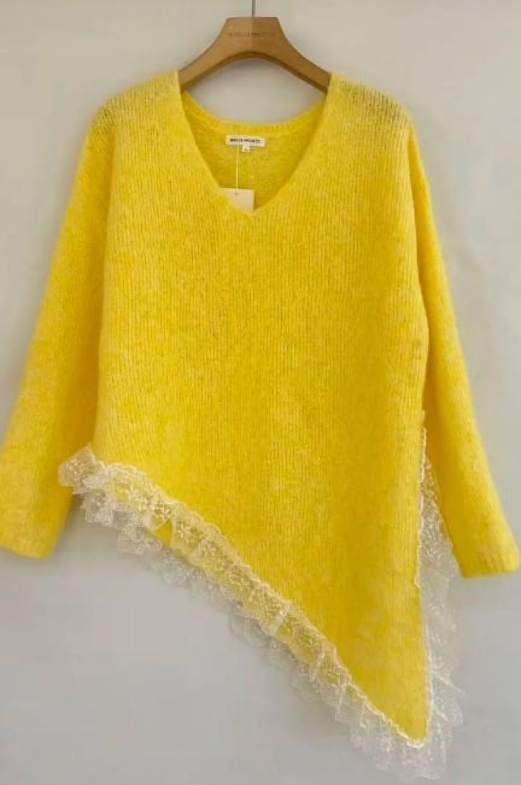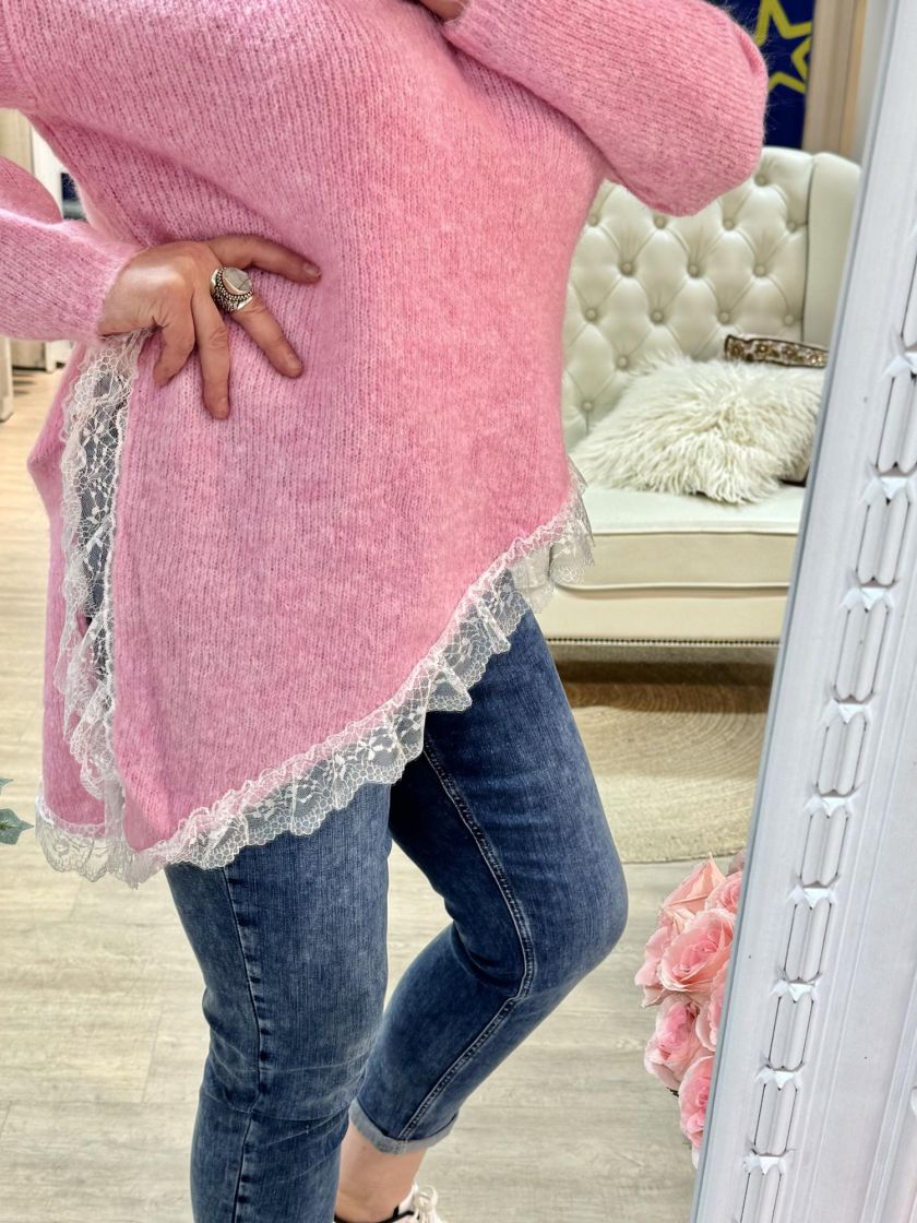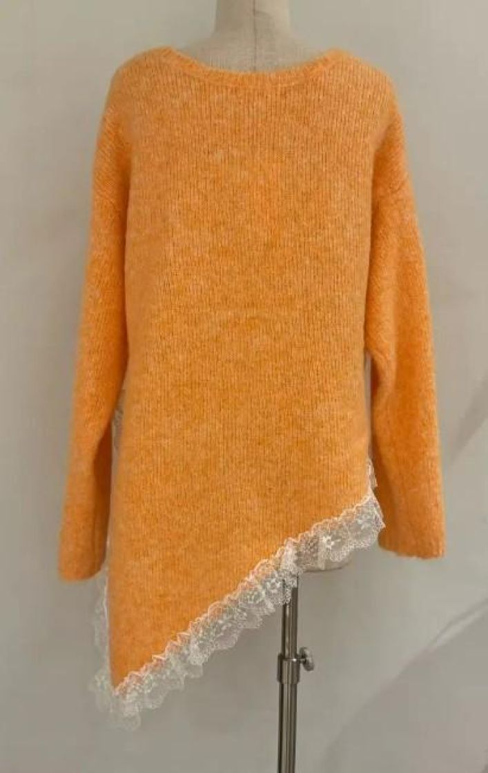 New Collection pehmeä ja pörröinen neuletunika/pusero. Puserossa on vinohelma ja kaunis pitsi helmassa. Mallissa on reilu v-pääntie ja neulos kivasti meleerattua. Yhden koon malli noin 38-42 kokoisille.