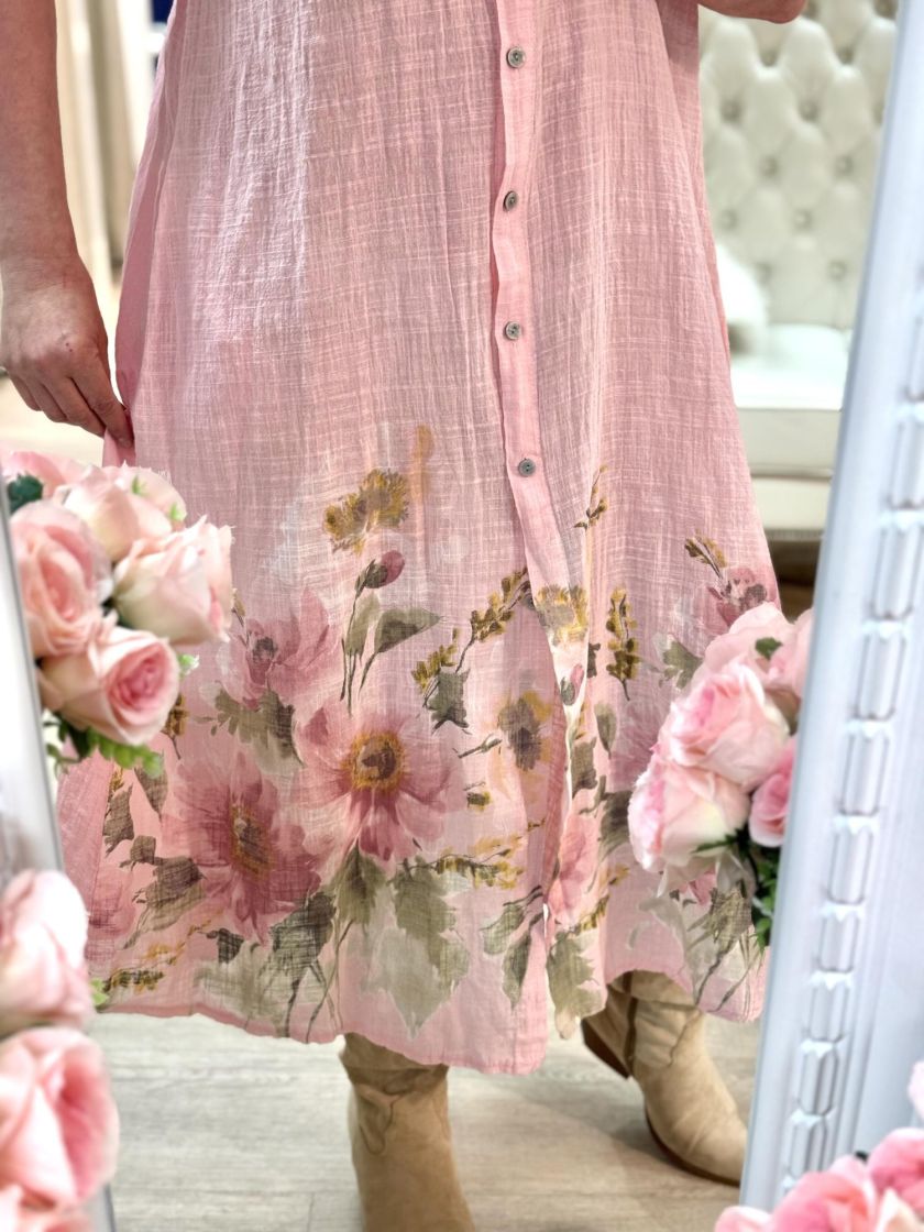 New Collection paitamekko kauniilla kukkakuviolla. Edessä napit ja sivuilla rentoutta tuo taskut. Materiaali ihanan pehmoista puuvillaa. Voi myös pitää jakkuna ja vyö tuo mekkoon linjakkuutta. Yhden koon malli noin 40-44 kokoisille. Tarkistathan mitat.
