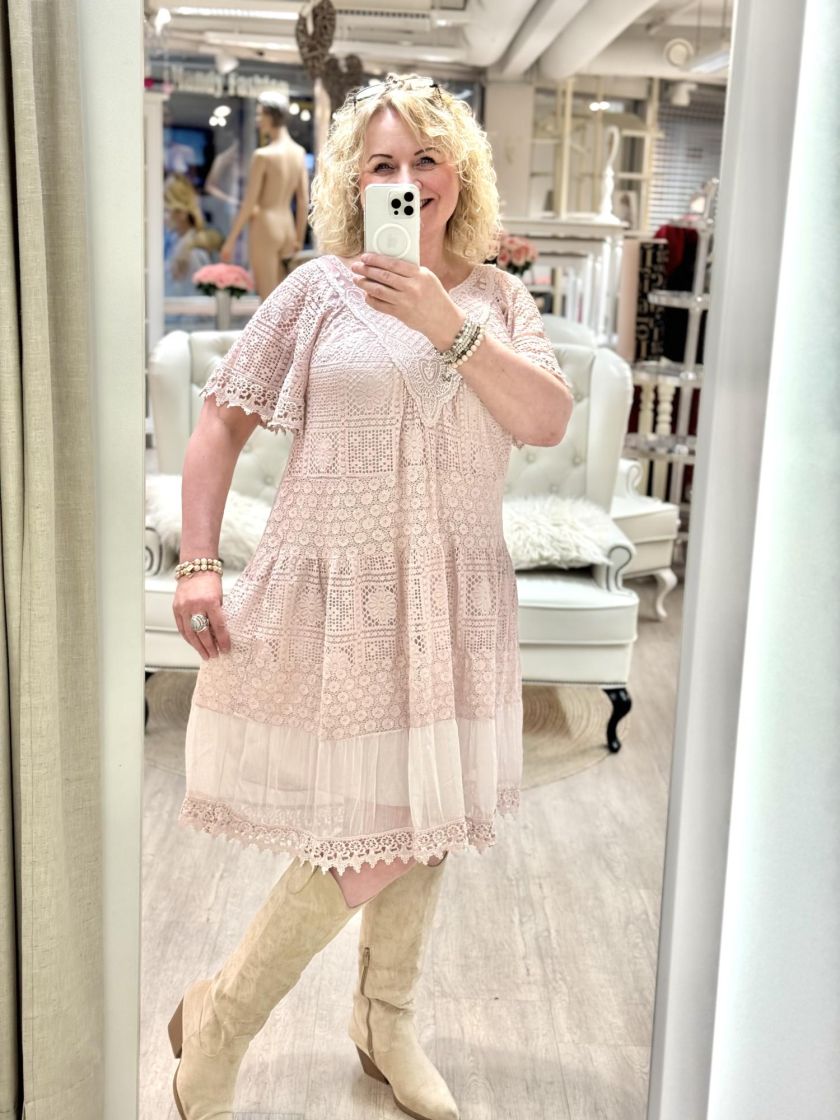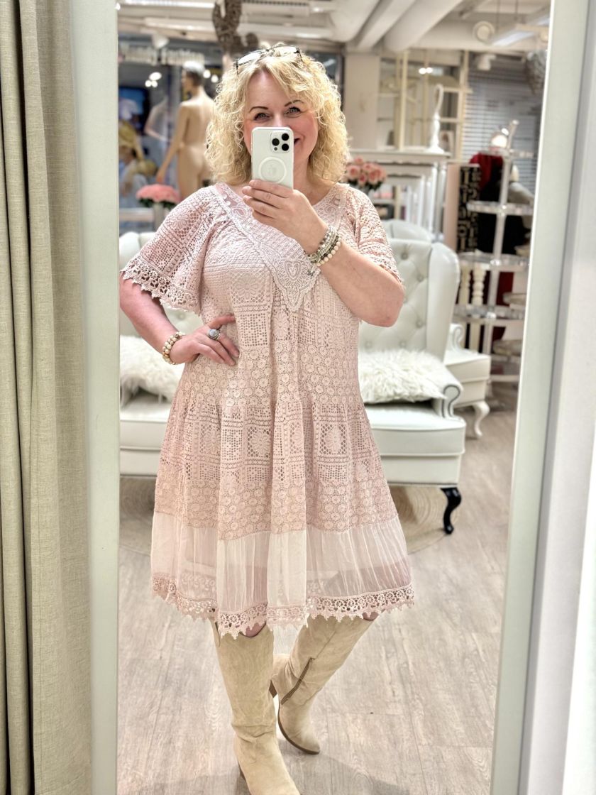New Collection mekko kauniilla pitseillä. Mallissa on yhdistetty kivasti pitsiä ja silkki-viskoosia. Alla on mukavan joustava trikoovuori. Kaunis pääntie ja söpöt pitsiset hihat. Mekossa kimaltaa paljetteja. Yhden koon malli noin 40-44 kokoisille. Tarkistathan mitat.