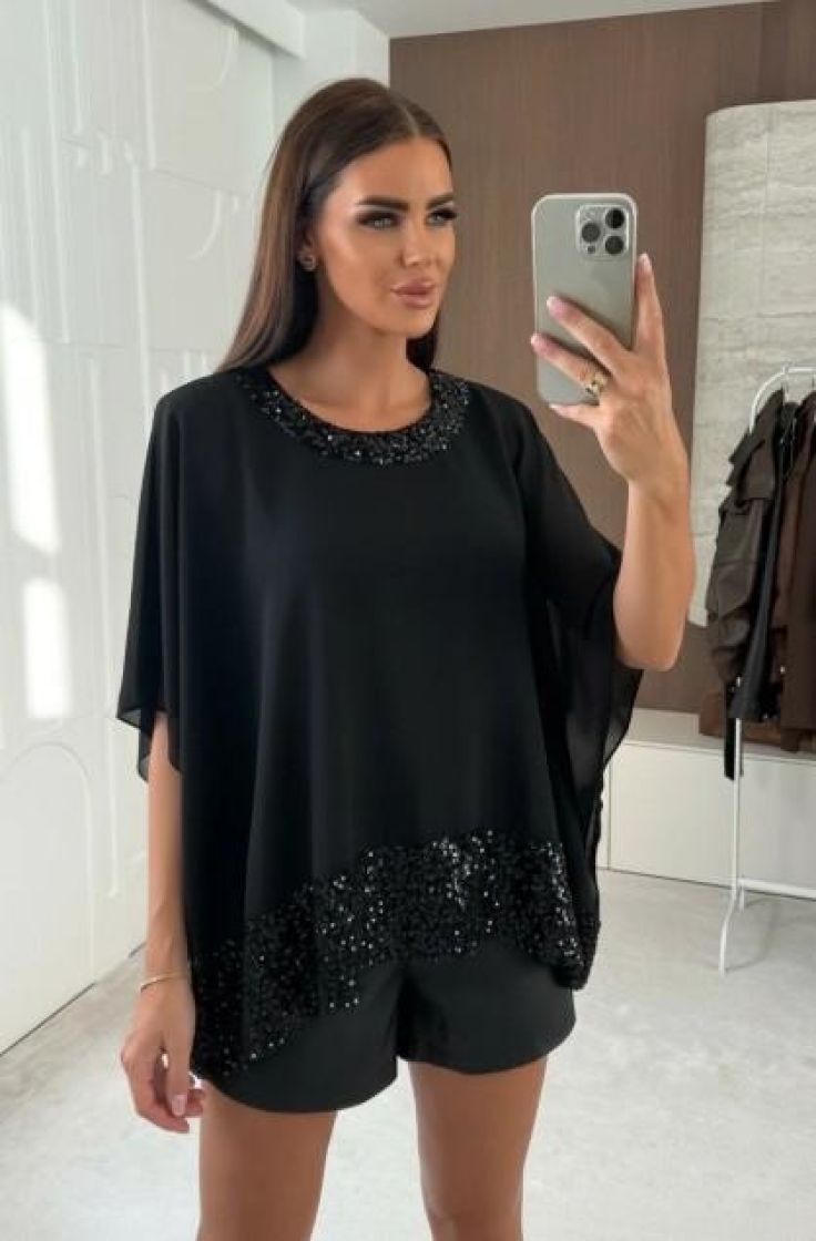 New Collection kauniisti laskeutuva ponchopusero. Puserossa on paljetein koristeltua joustovelouria helmassa ja pääntiellä edessä. Sivut on ommeltu kiinni ja alla on hyvin joustava vuori ohutta viskoositrikoota. Yhden koon malli noin 36-40 kokoisille.