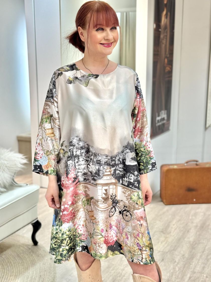 New Collection kaunis satiinipintainen hieman kiiltävänpintainen kuviollinen tunikamekko. Kuvioinnissa on maisemaa, polkupyörä ja puutarhamaisia elementtejä. Kangas laskeutuu kauniisti ja kevyesti. Mekoissa on eri kuviointia. Vyöllä saa istuvuutta mekkoon. Malli on istuvampi yläosasta ja levenee helmaa kohden. Yhden koon malli ja vastaa n.36-42 kokoa.