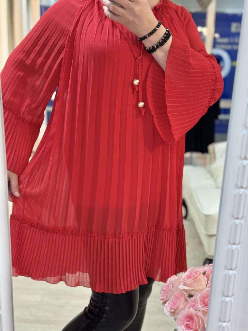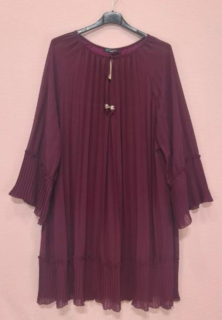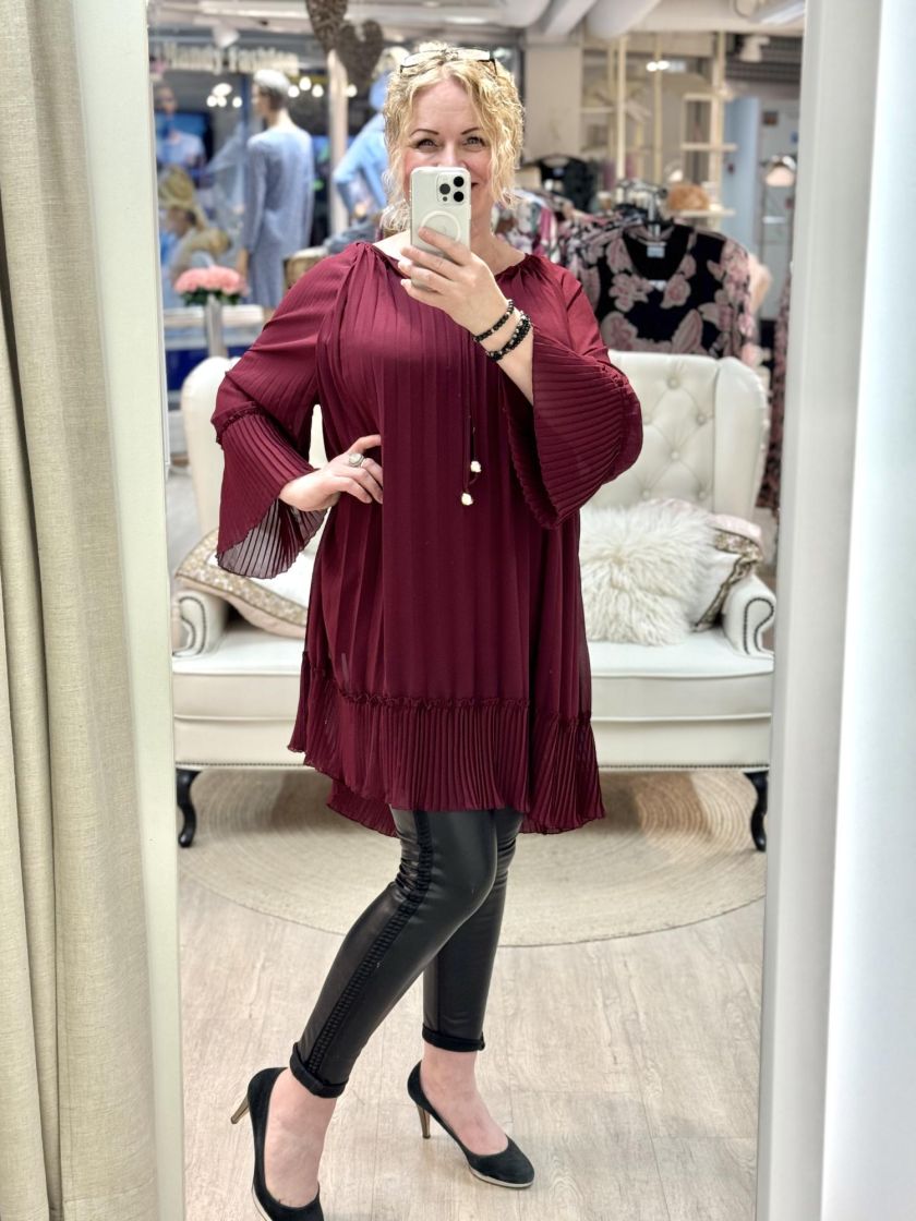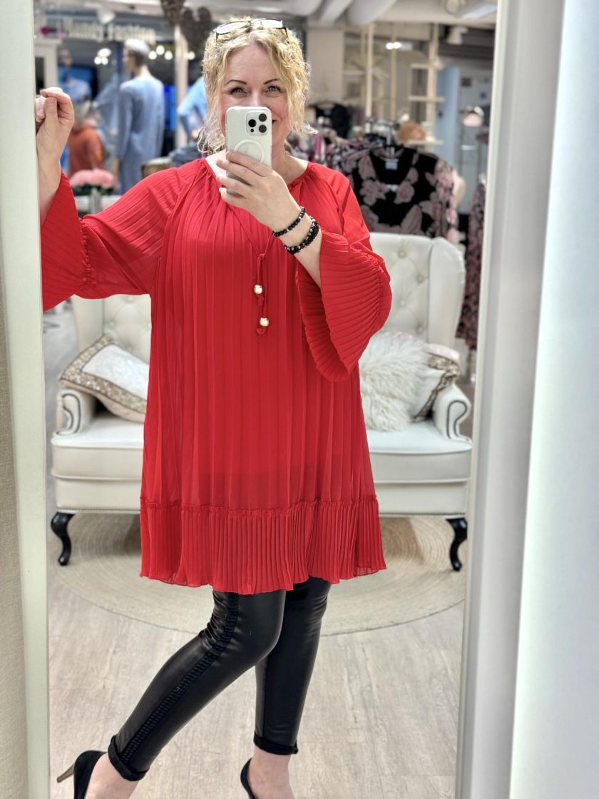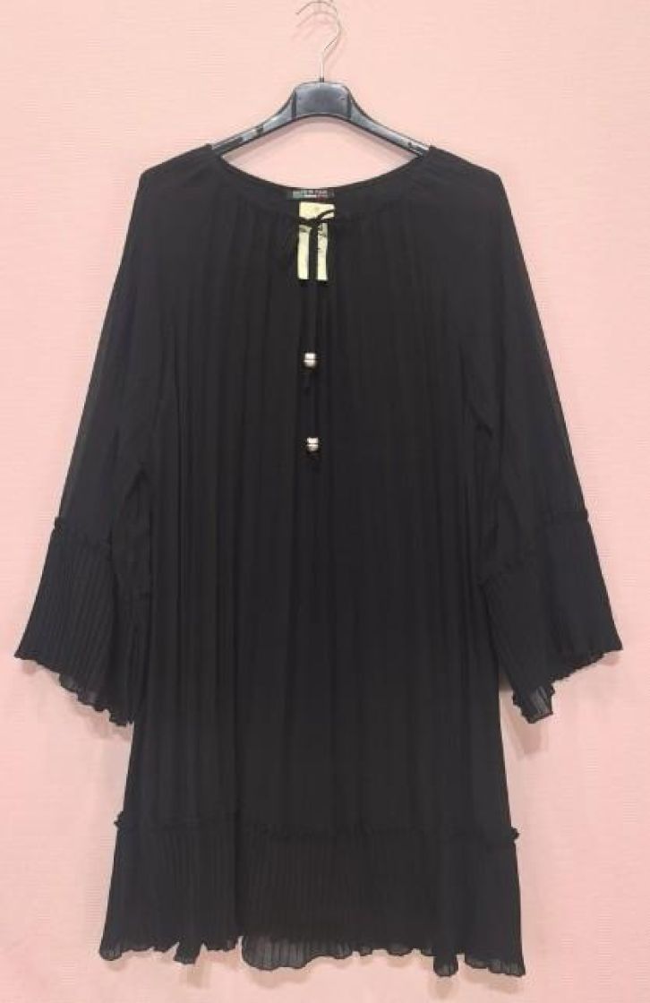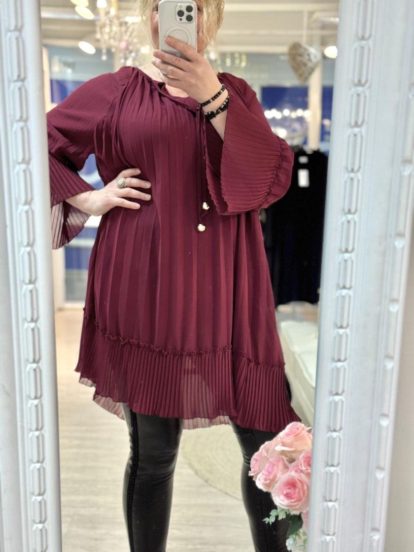 New Collection kauniisti pliseerattu a-linjainen sifonkimekko/tunika. Mekkotunikassa on yhdistetty kauniisti leveämpää ja kapeampaa pliseerausta. Mallissa on väljä raglanhiha, avoin pääntie ja pääntiellä solmittavat pallonauhat. Alla on hyvin joustava ja lyhyt vuori ohutta viskoositrikoota. Yhden koon malli noin 42-46 kokoisille.