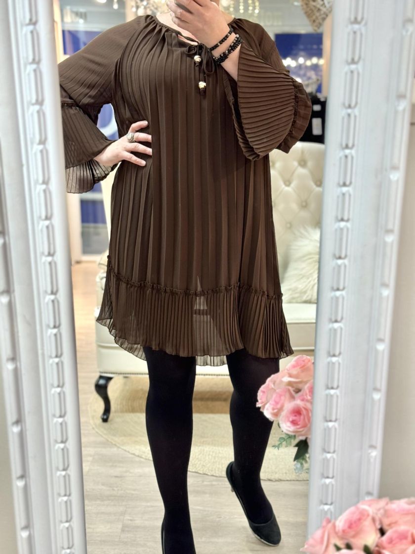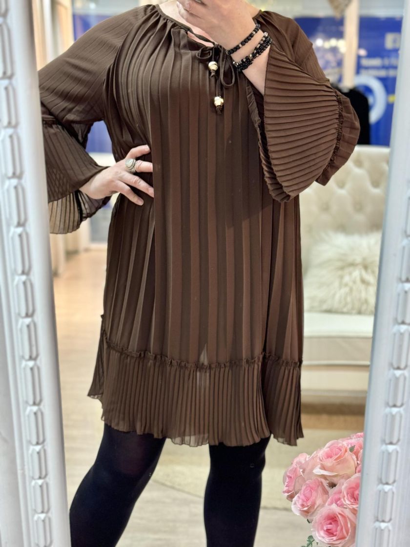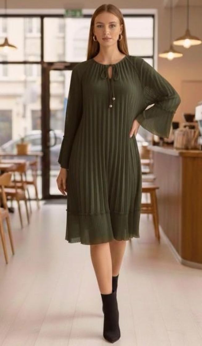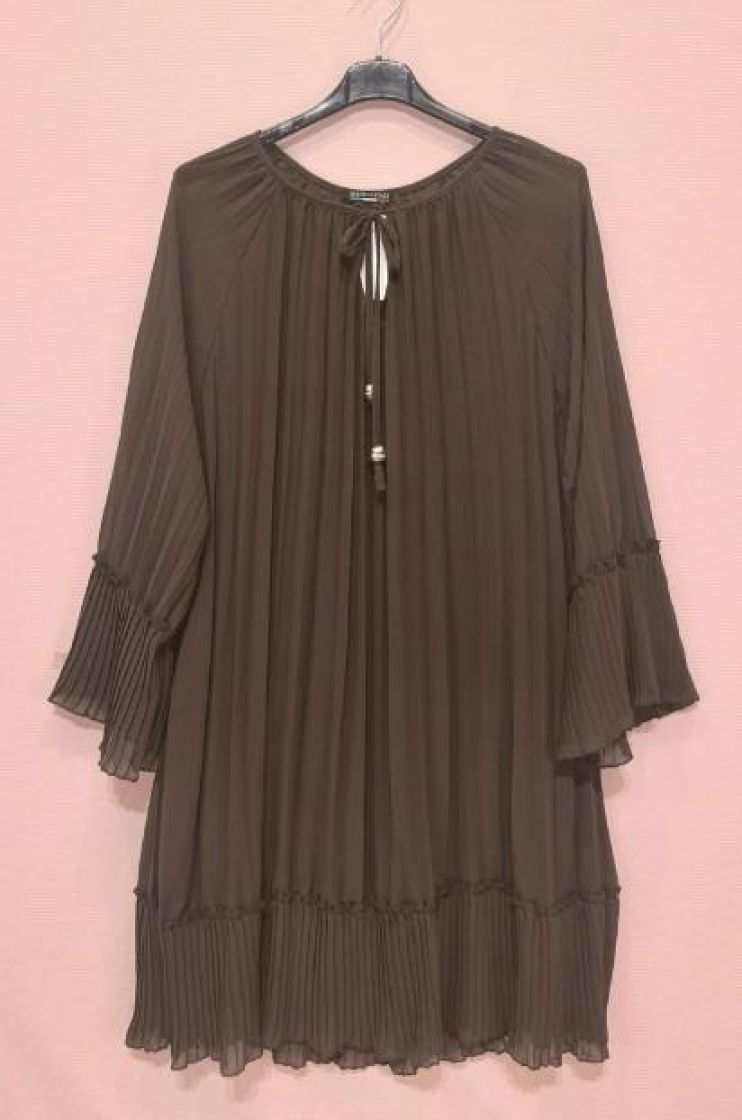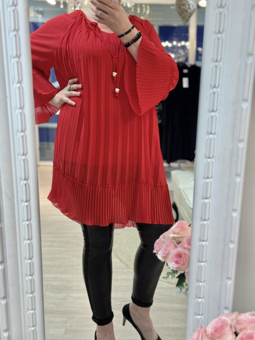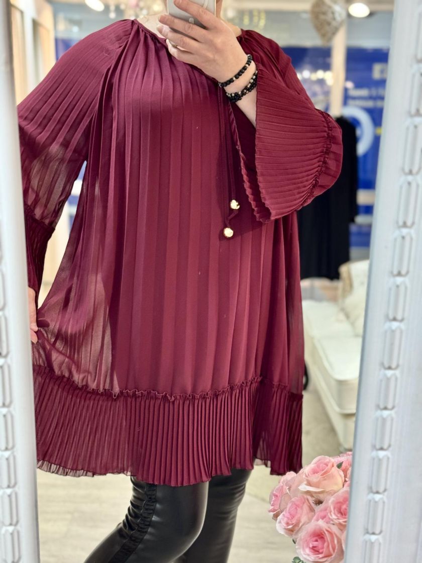 New Collection kauniisti pliseerattu a-linjainen sifonkimekko/tunika. Mekkotunikassa on yhdistetty kauniisti leveämpää ja kapeampaa pliseerausta. Mallissa on väljä raglanhiha, avoin pääntie ja pääntiellä solmittavat pallonauhat. Alla on hyvin joustava ja lyhyt vuori ohutta viskoositrikoota. Yhden koon malli noin 42-46 kokoisille.