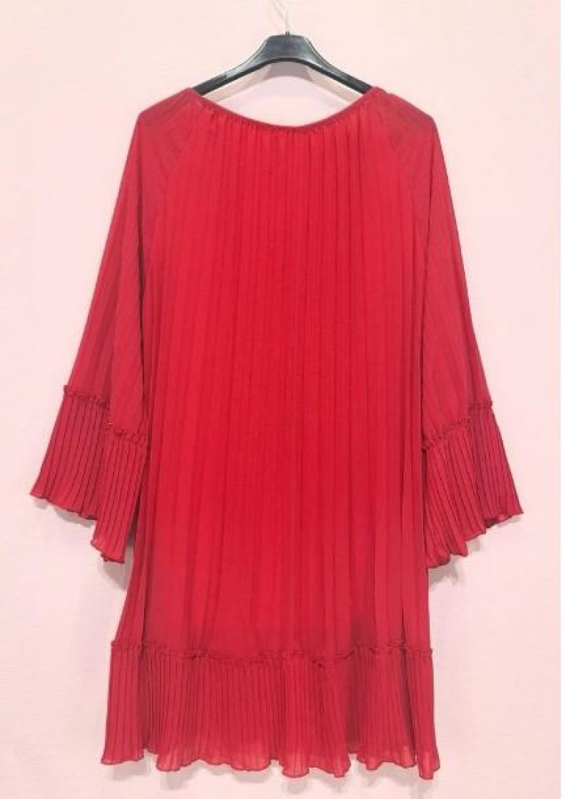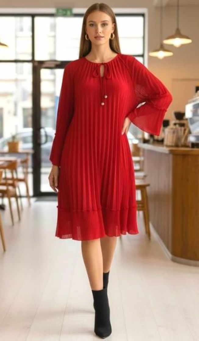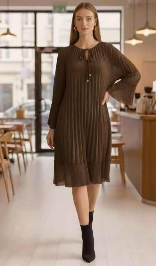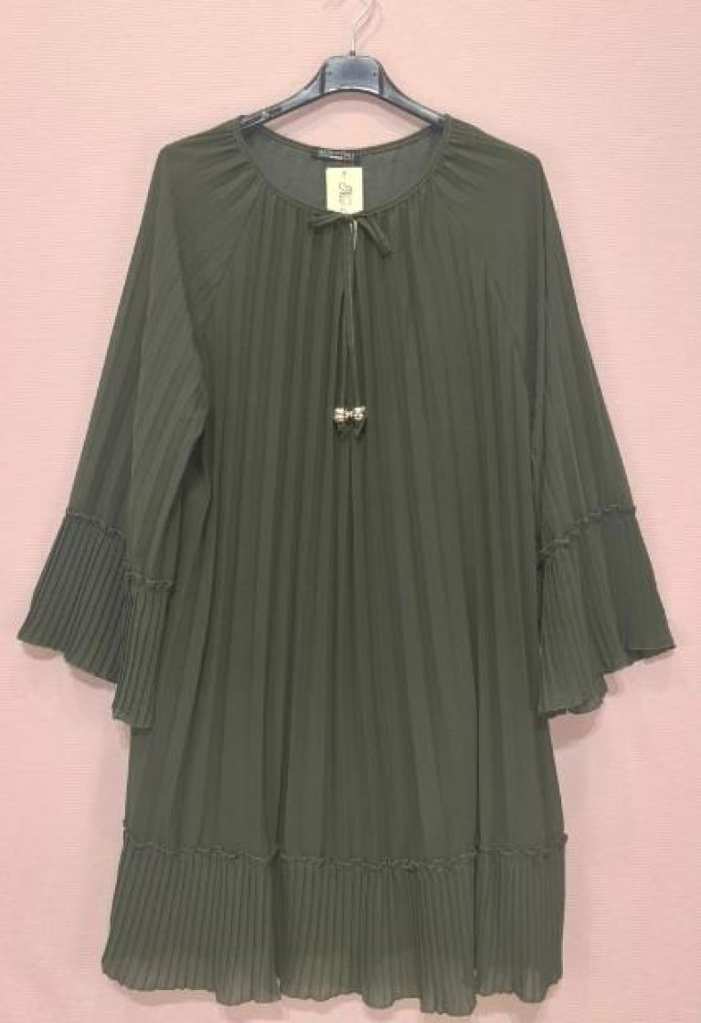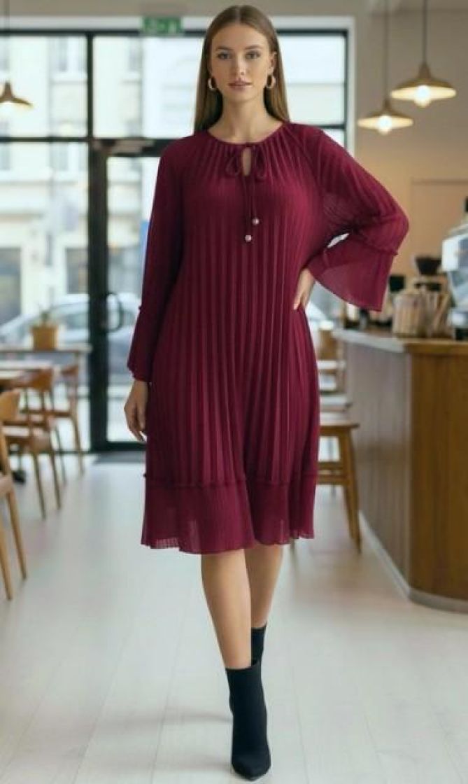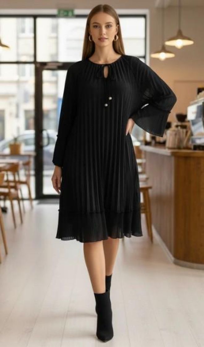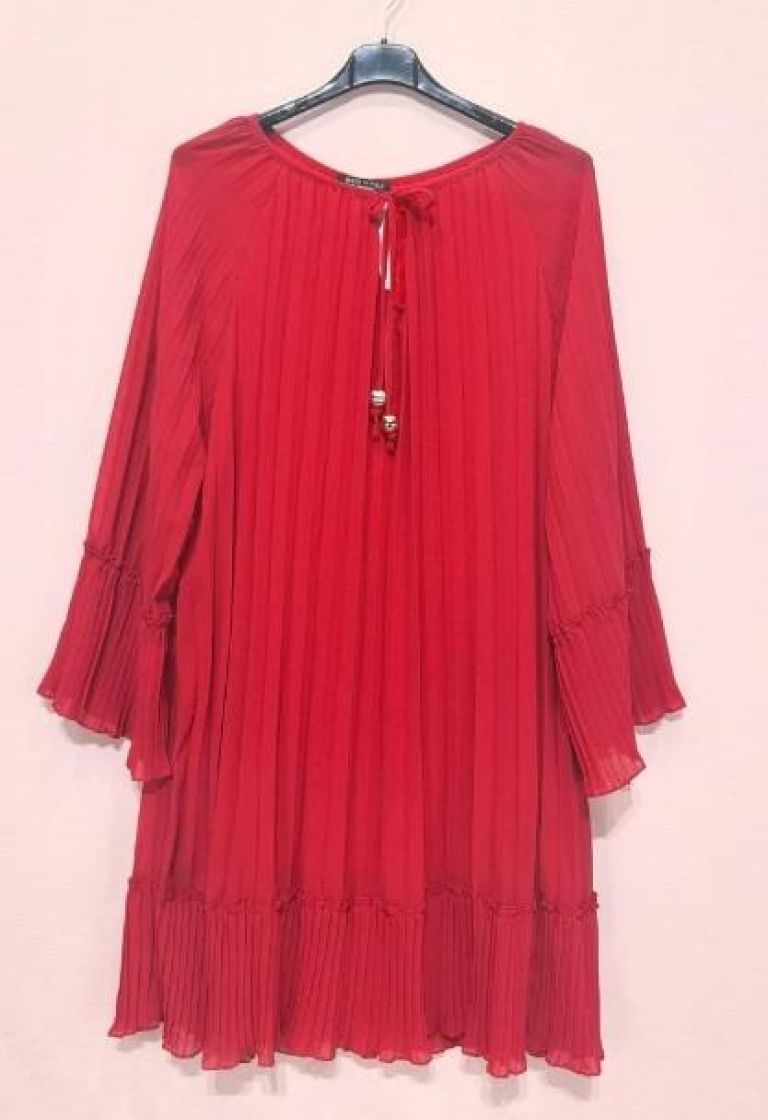 New Collection kauniisti pliseerattu a-linjainen sifonkimekko/tunika. Mekkotunikassa on yhdistetty kauniisti leveämpää ja kapeampaa pliseerausta. Mallissa on väljä raglanhiha, avoin pääntie ja pääntiellä solmittavat pallonauhat. Alla on hyvin joustava ja lyhyt vuori ohutta viskoositrikoota. Yhden koon malli noin 42-46 kokoisille.
