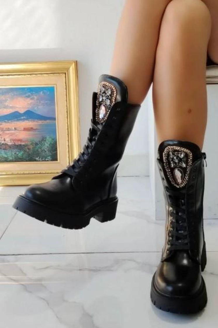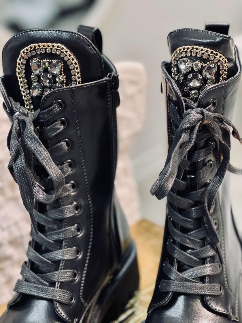 New Collection kevyet maiharit reilulla traktoripohjalla ja upealla strassikoristeella. Sisäsivulla on vetoketju ja edessä nauhat. Materiaali on kevyttä, ohutta ja hieman kiiltopintaista keinonahkaa. Sisällä on ohut sekä pehmeä vuori. Normaali mitoitus.