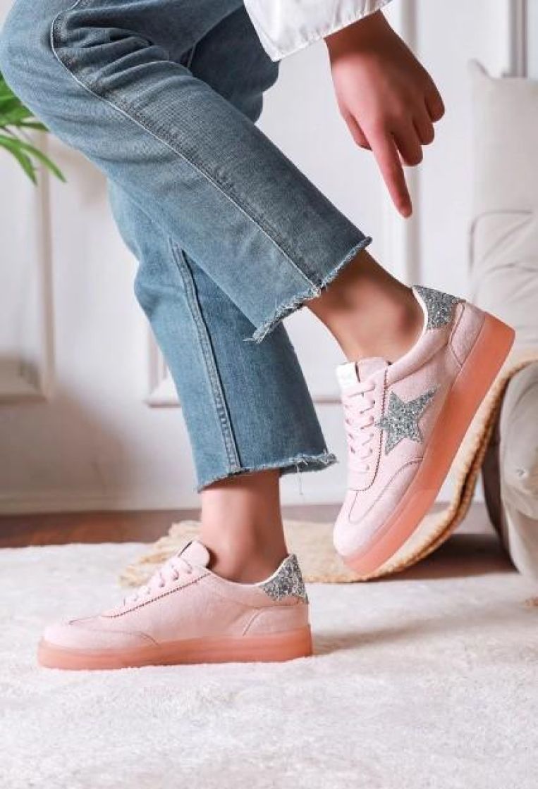 New Collection tennarit pehmeää roosanväristä keinomokkaa. Jujuna on makea tähti ja takaosa hopeahilettä. Edessä on nauhat ja kenkien materiaali on kevyttä. Malli on hieman kapeampi ja mitoitus aavistuksen pienempi.