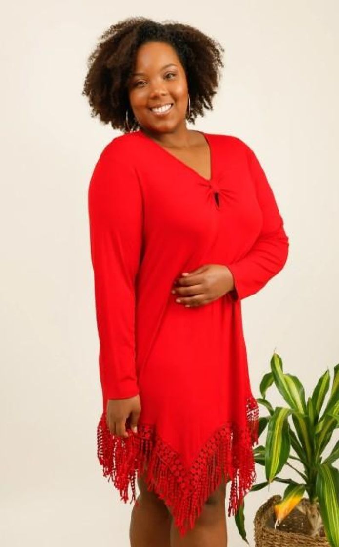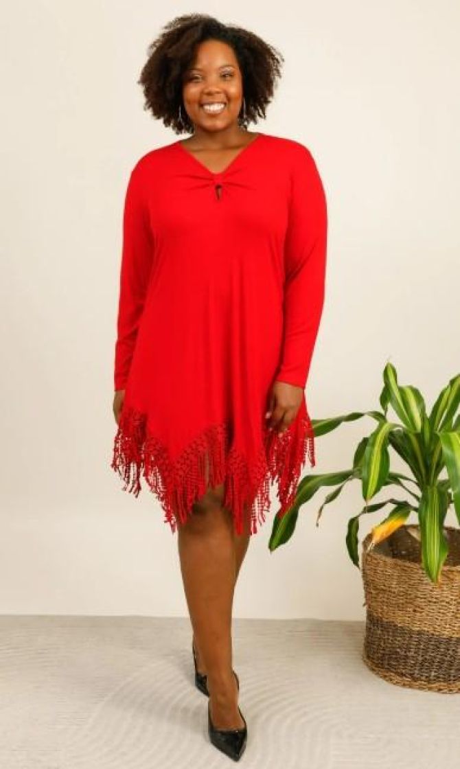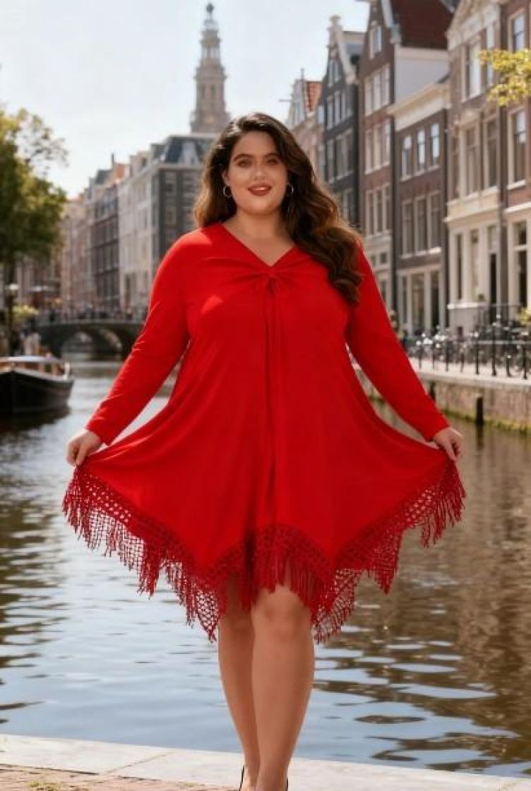 Plusmallistoa New Collection trikoomekko. Mekossa on kaunis v-pääntie ja helmassa upea hapsupitsi. Malli on a-linjainen ja materiaalina mukavan ohut ja joustava viskoositrikoo. Mitoitus on reilu ja materiaali hyvin mukautuvaa, joten tarkistathan mitat.