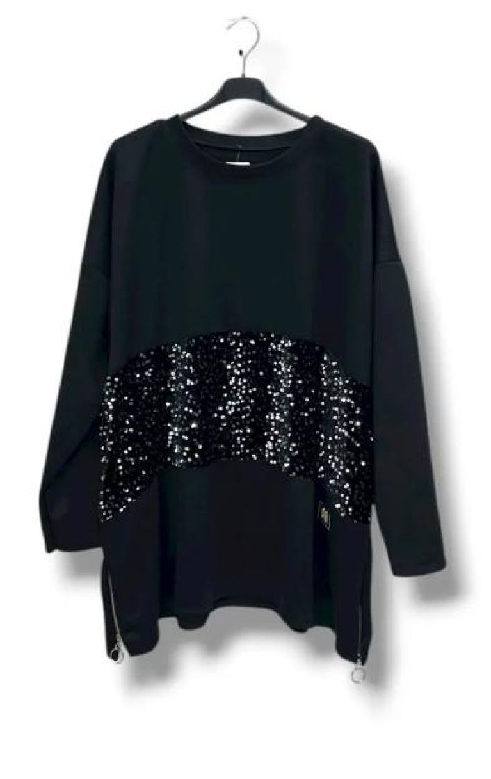 Plusmallistoa New Collection makea collegetunika. Jujuna on edessä raita paljettikoristeista samettia. Helmassa ilmettä antaa reilut vetoketjut. Yhden koon malli noin 44-50 kokoisille. Mitoitus on reilu, joten tarkistathan mitat.