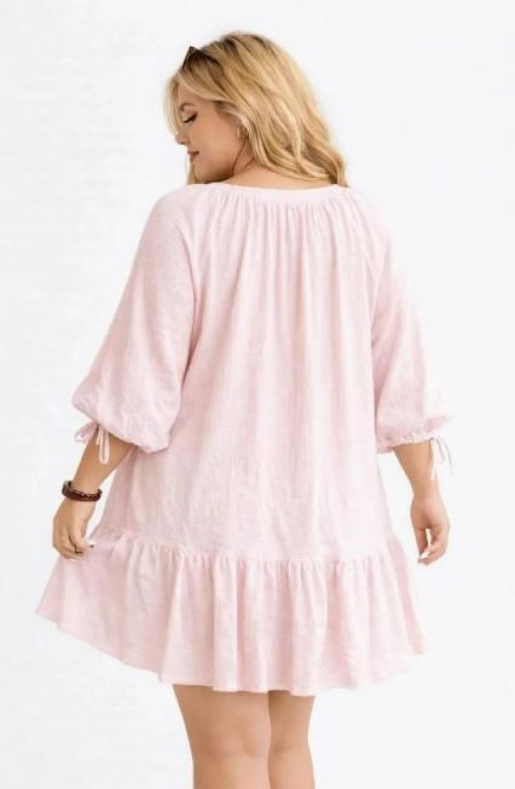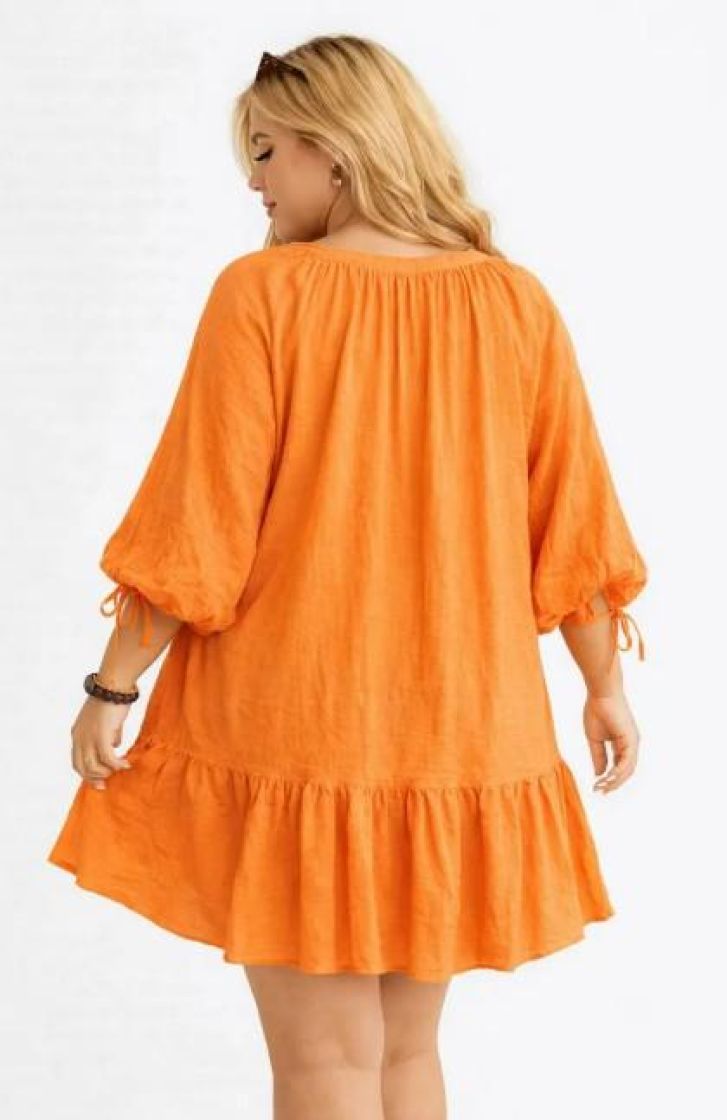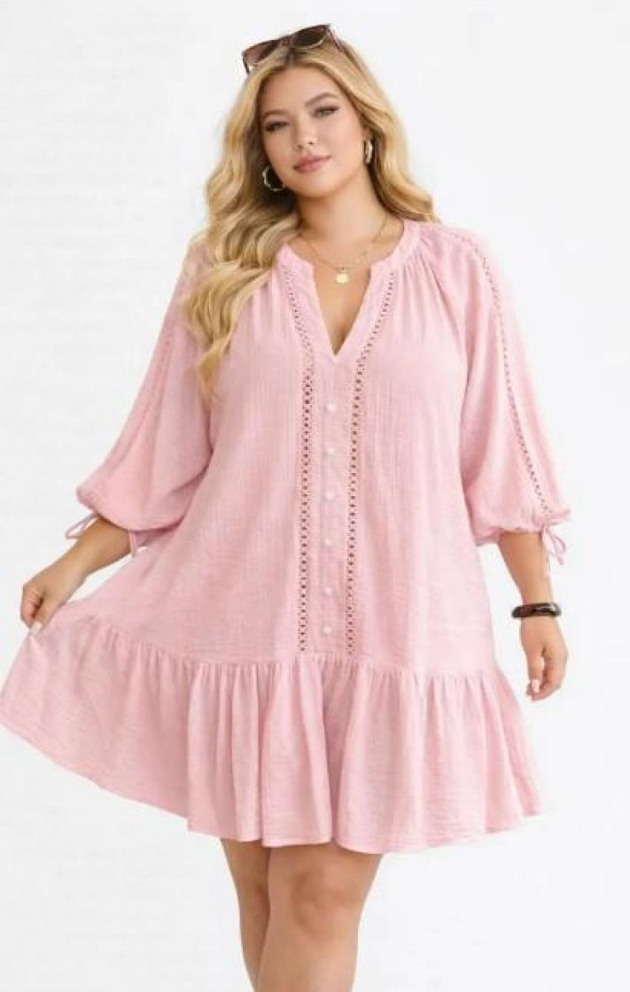Plusmallisto New Collection söpö tunikamekko. Materiaali pumpulin pehmeää puuvillaa. Koristenapit edessä ja hihansuussa kuminauharesori nauhalla tuo ryhtiä hihoihin ja pitää ne paikoillaan. Helmassa kaunis frilla. Yhden koon malli noin 46-50 kokoisille. Tarkistathan mitat.