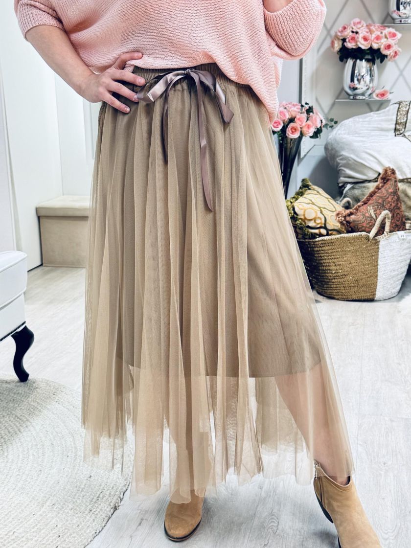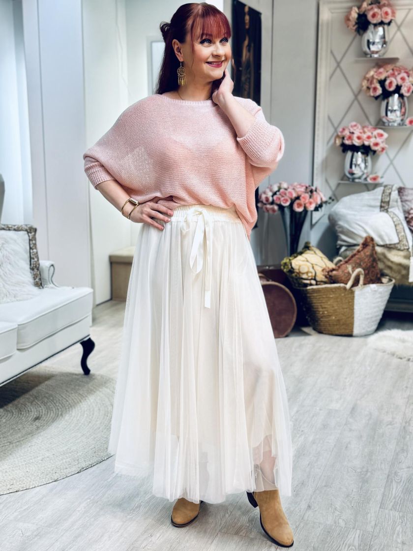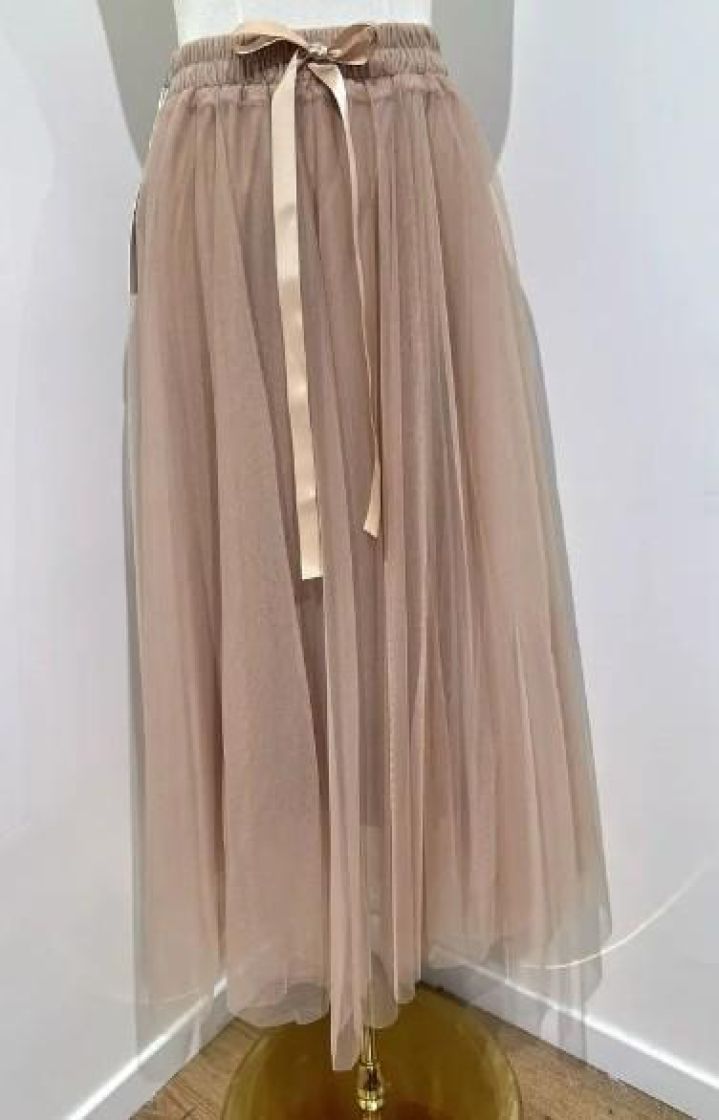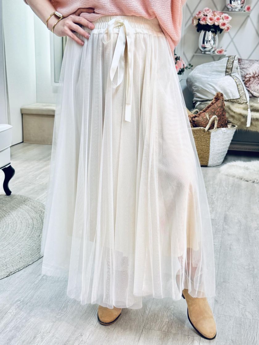 New Collection kaunis tyllihame. Malli on kellohelmainen ja vyötäröllä mukavuutta antaa joustava vyötärönauha. Vyötärönauhan kruunaa solmittavat satiininauhat. Alla on ohut ja joustava vuori. Yhden koon malli noin 36-44 kokoisille.