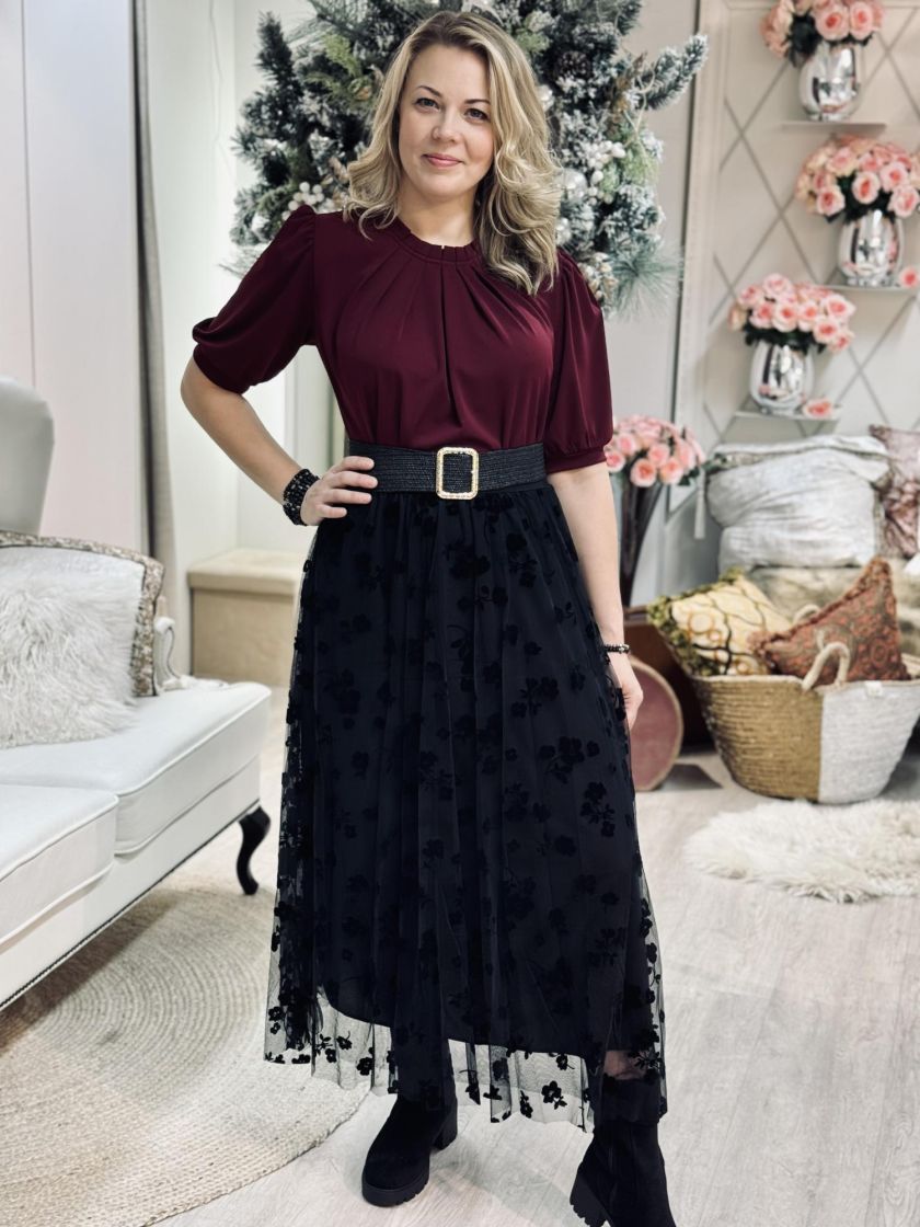 Plusmallistoa New Collection tyllihame kauniilla samettikukilla. Malli on kellohelmainen ja vyötäröllä mukavuutta antaa joustava vyötärönauha. Vuori on hyvin ohutta sekä joustavaa trikoota. L koko vastaa noin 38-42 kokoa.