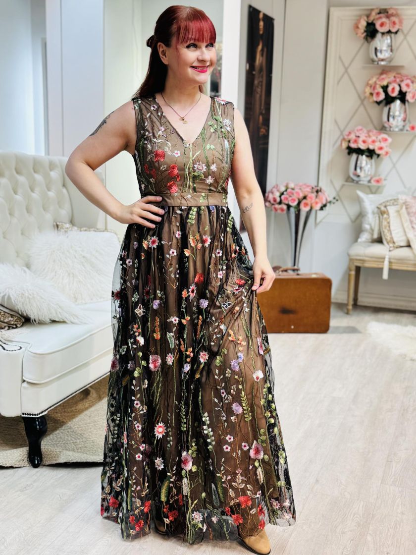 New Collection romanttinen tyllimekko. Alla mukava kiinniommeltu joustava alusmekko. Päällinen läpinäkyvää harsomaista kangasta. Mekossa kirjailtu kauniita kukkia. Vyötäröllä poikkileikkaus tuo linjakkuutta ja istuvuutta. Takana vetoketju. Tarkistathan mitat. Malli on pienempää mitoitusta.