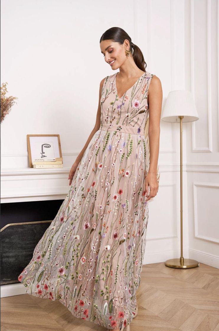 Täydellinen mekko kesäjuhliin. New Collection romanttinen tyllimekko. Alla mukava kiinniommeltu joustava alusmekko. Päällinen läpinäkyvää harsomaista kangasta. Mekossa kirjailtu kauniita kukkia. Vyötäröllä poikkileikkaus tuo linjakkuutta ja istuvuutta. Takana vetoketju. Tarkistathan mitat. Malli on pienempää mitoitusta.