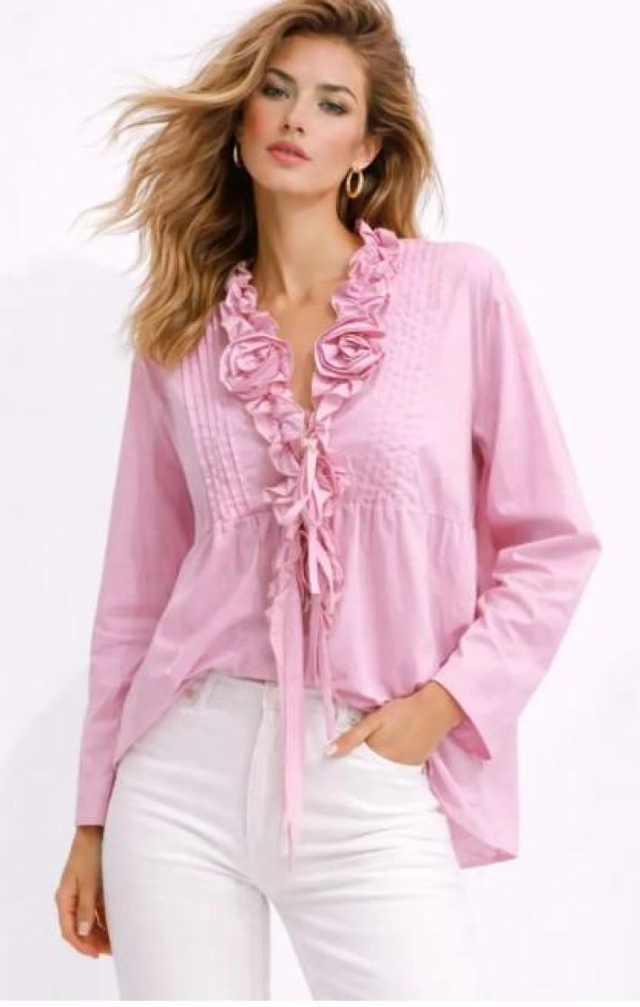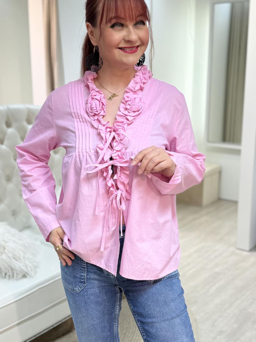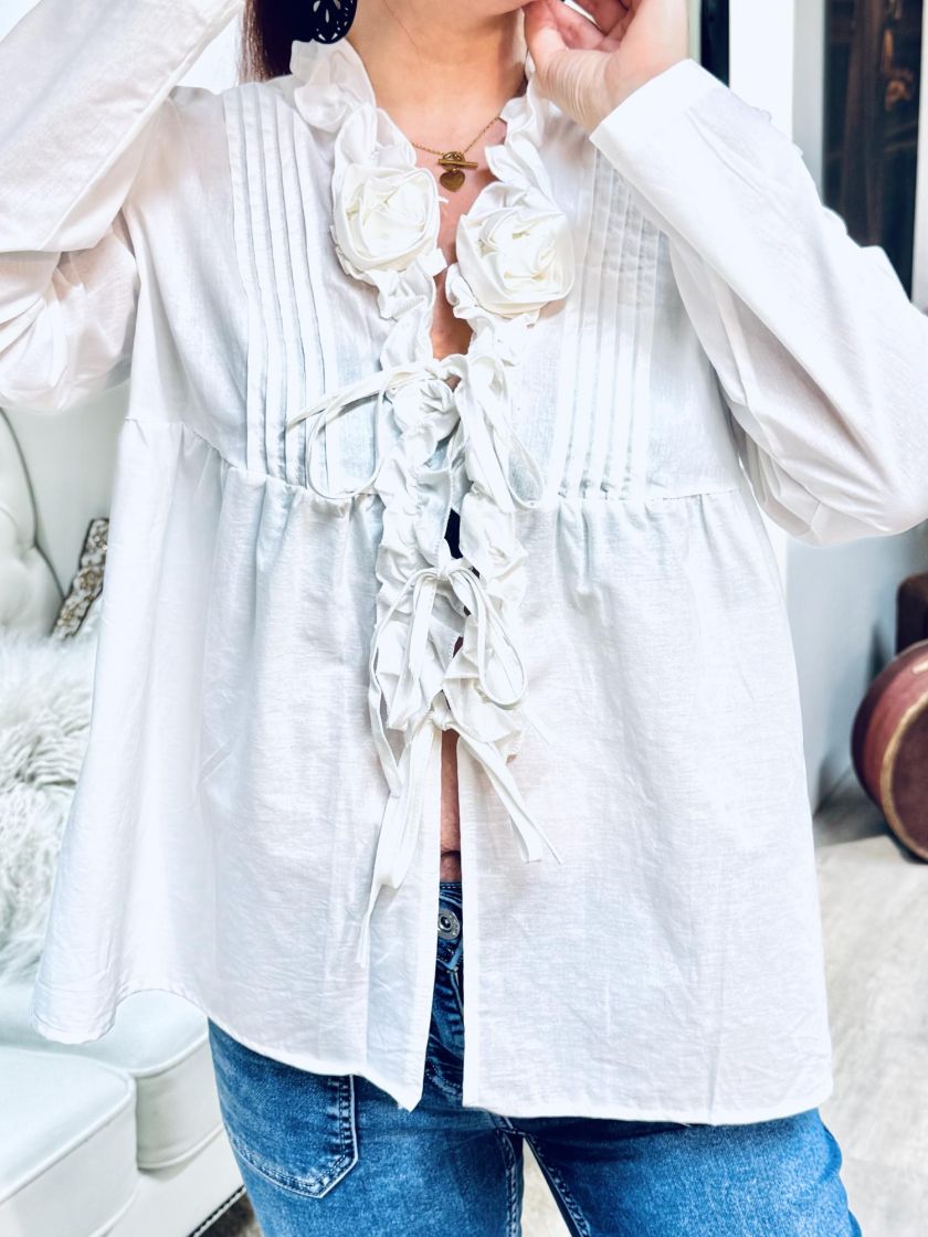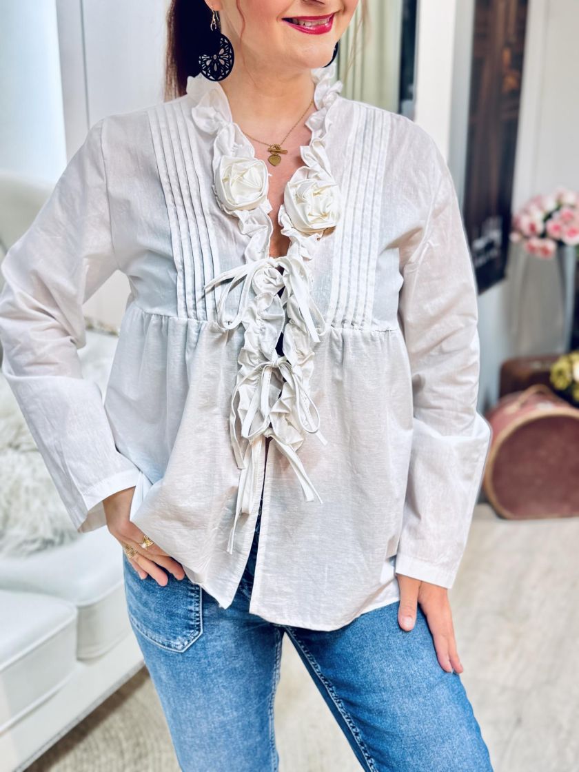 New Collection frillajakku/pusero kevyttä ja ohutta puuvillaa. Pääntiellä on kauniit frillat ja ruusukkeet. Edessä lisäilmettä antaa hiuslaskokset ja kiinnitys on nauhoilla.
