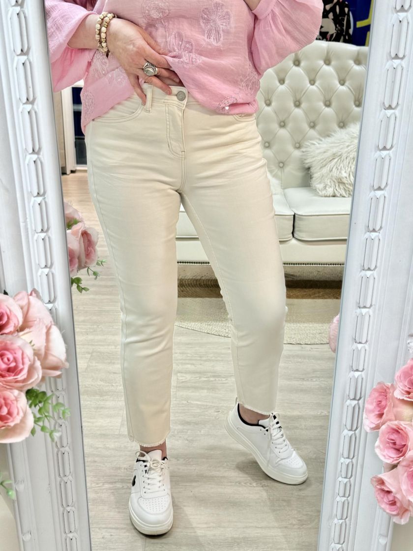Street One nilkkamittaiset farkut pehmeää ja joustavaa puuvillaa. Sivuilla jujuna sporttinen tehostenauha ja lahkeissa kivat hapsureunat. Normaali vyötärön korkeus. Malli on istuva ja lahkeensuu suora.