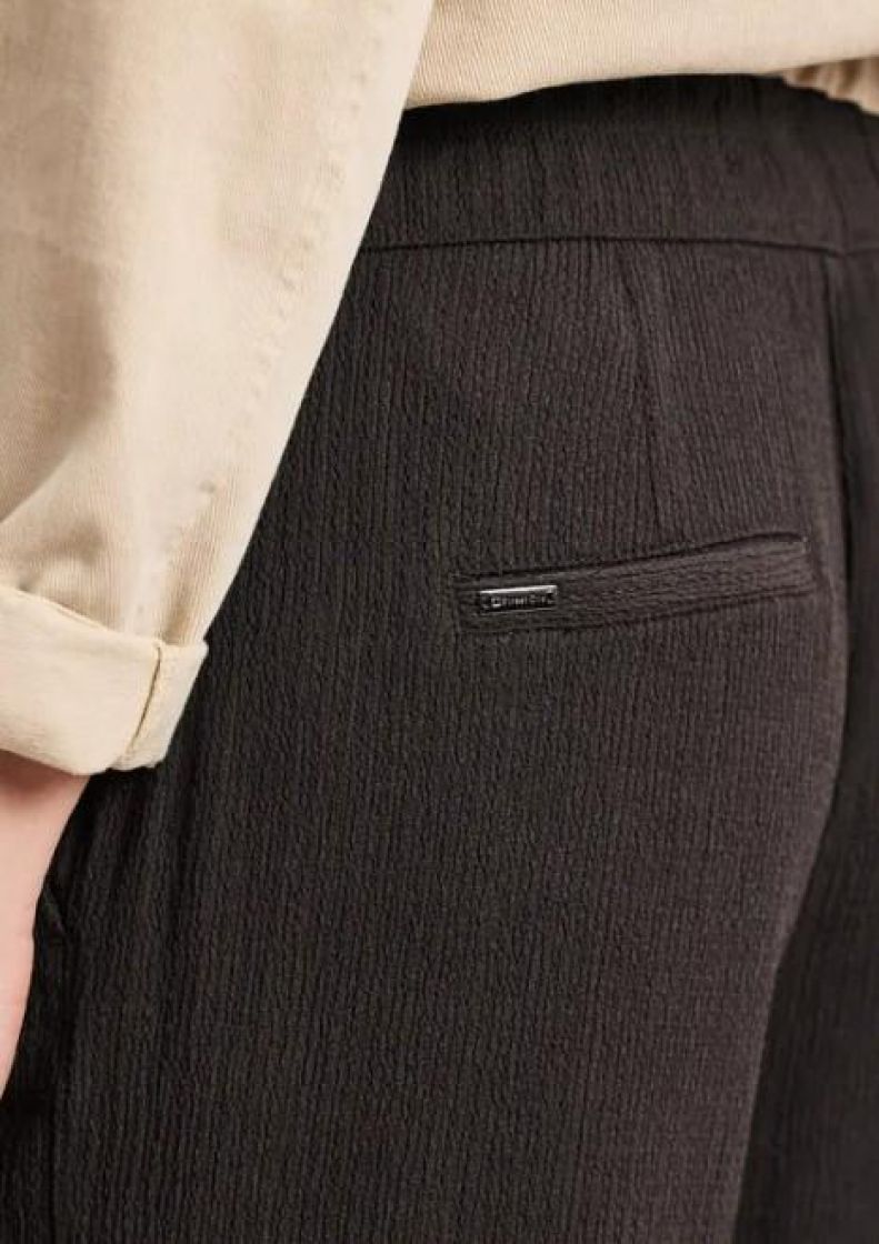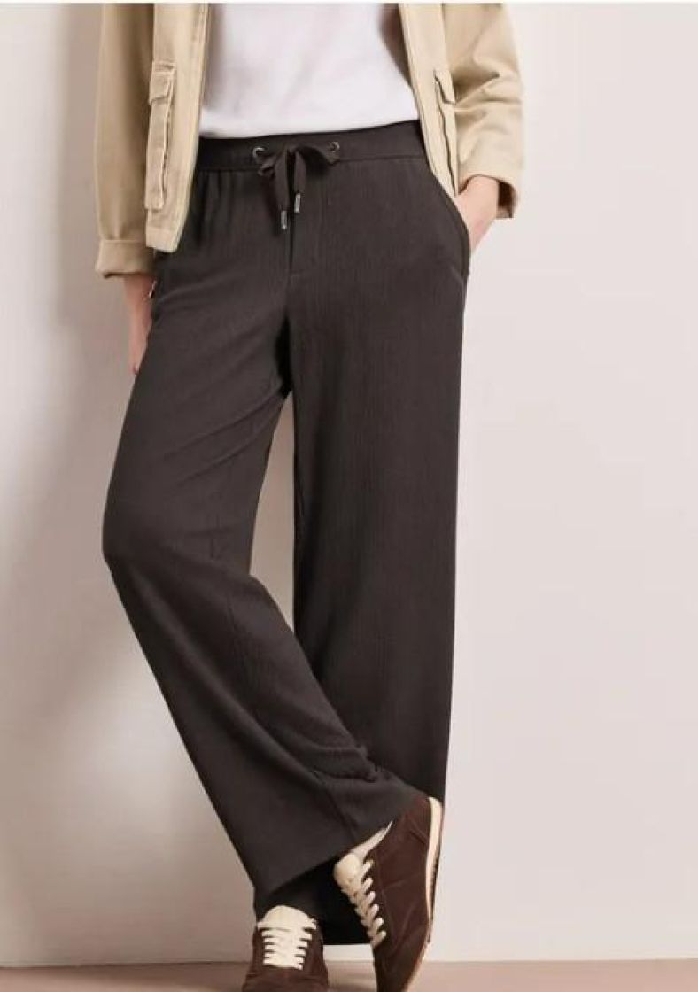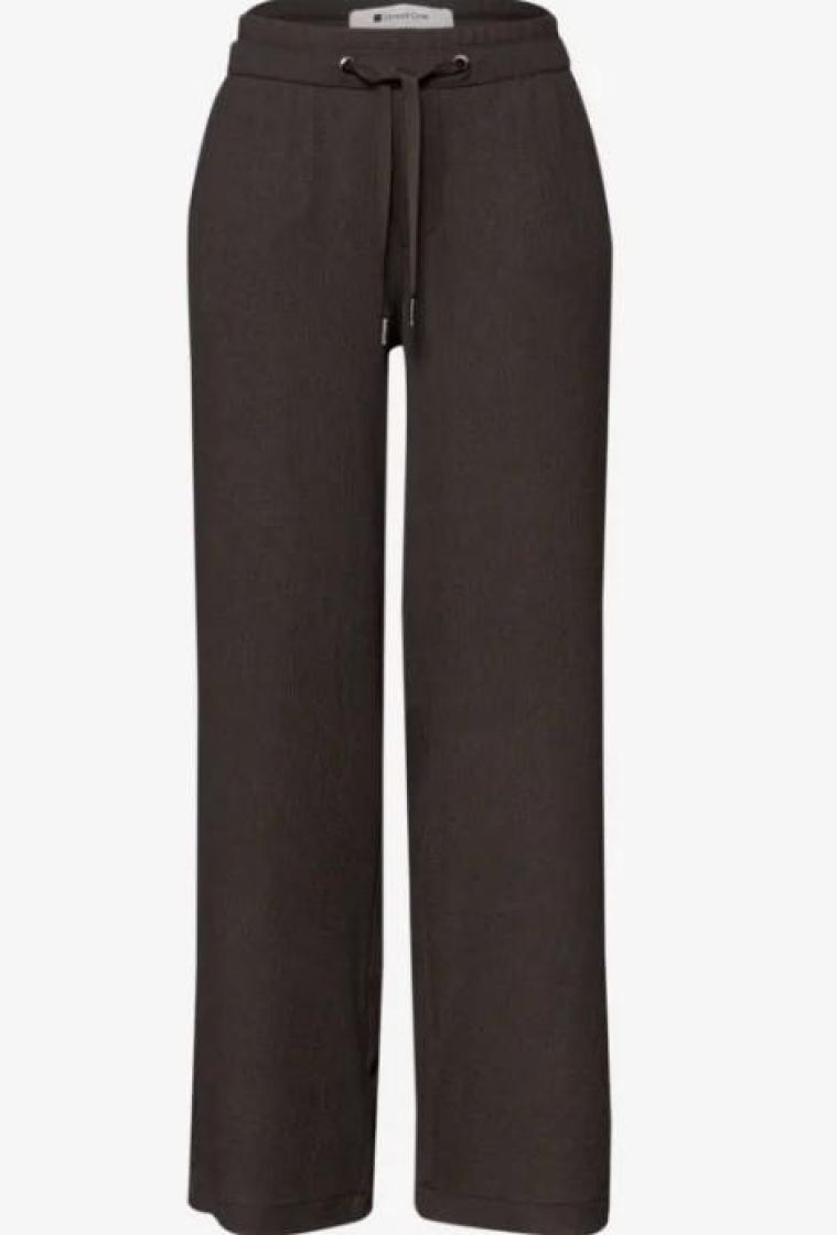 Street On mukavan kevyet ja ilmavat housut pehmeää kreppiviskoosisekoitetta. Kangas kivan ryppypintaista ja mallissa mukavuutta tuo joustovyötärö nauhakiristyksellä. Sivuilla taskut ja takana valetaskut. Kivan leveät lahkeet.